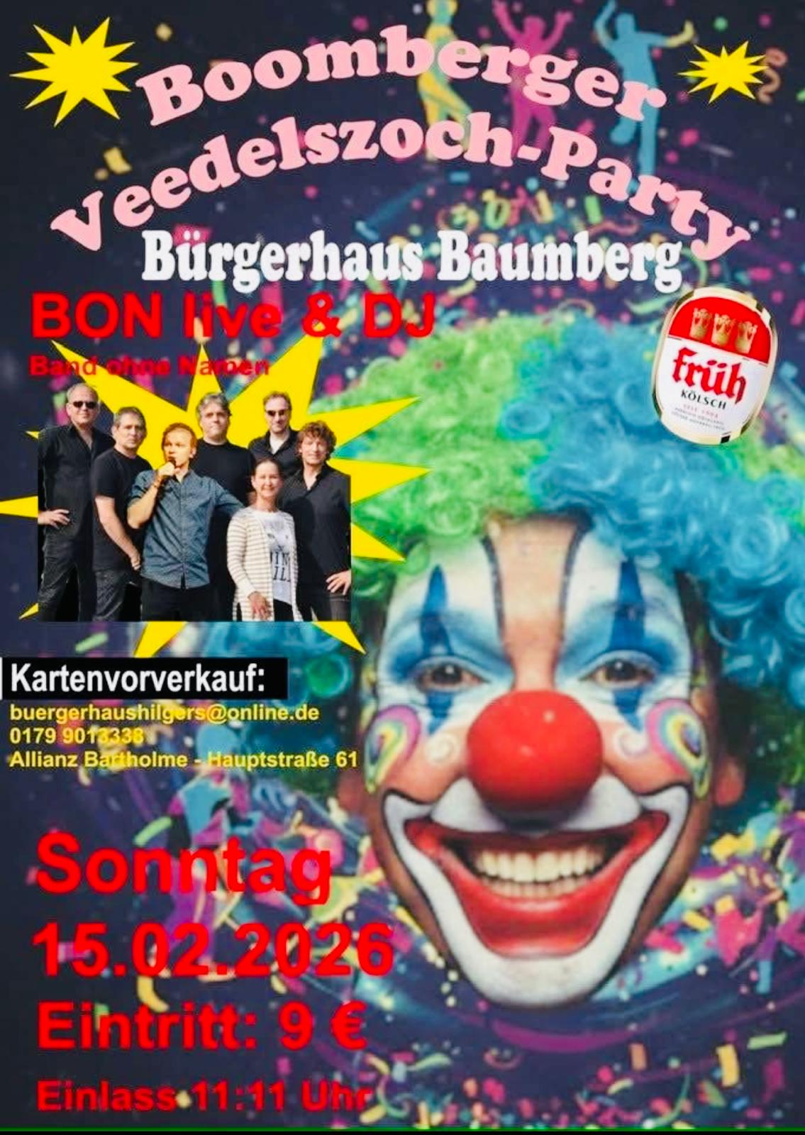 Der Zoch schlängelt sich seinen Weg direkt am Bürgerhaus Baumberg vorbei. Eine Begrüßung der Zugteilnehmerinnen und -teilnehmer wird es durch Boomberger Moderatorinnen und Moderatoren geben. Vor Ort wird Livemusik geboten, zwischendurch sorgen DJs für gute Unterhaltung. Das Prinzenpaar samt Gefolge hat sich ebenfalls angekündigt. Die Bewirtung übernimmt das Cateringteam Hilgers.