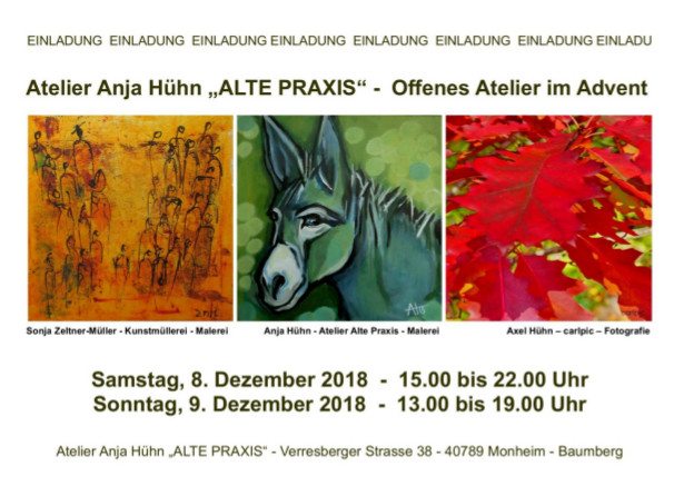 Die Künstlerin Anja Hühn öffnet am 8. und 9. Dezember gemeinsam mit zwei Gastkünstlern die Tür Ihres Ateliers, der Alten Praxis, in Baumberg.