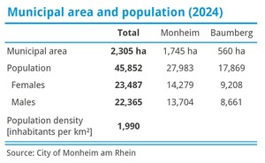 With a population of just under 46,000, Monheim am Rhein is classified as a medium-sized city. Covering an area of 2,305 hectares, the city consists of the two districts of Monheim and Baumberg.