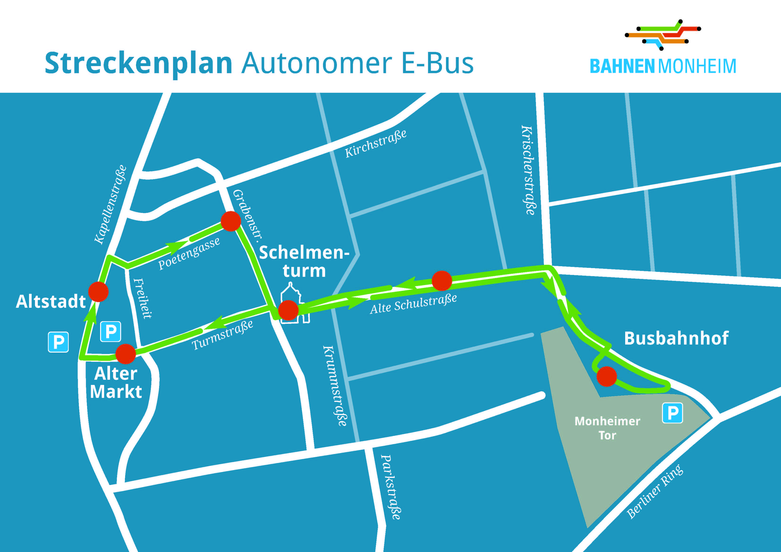 Monheims elektrisierende Buslinie der Zukunft wird jetzt auch im Stadtbild sichtbar. Im Zuge der Einführung der autonomen Busse wird in den kommenden Wochen die Einmessung der Strecke stattfinden.