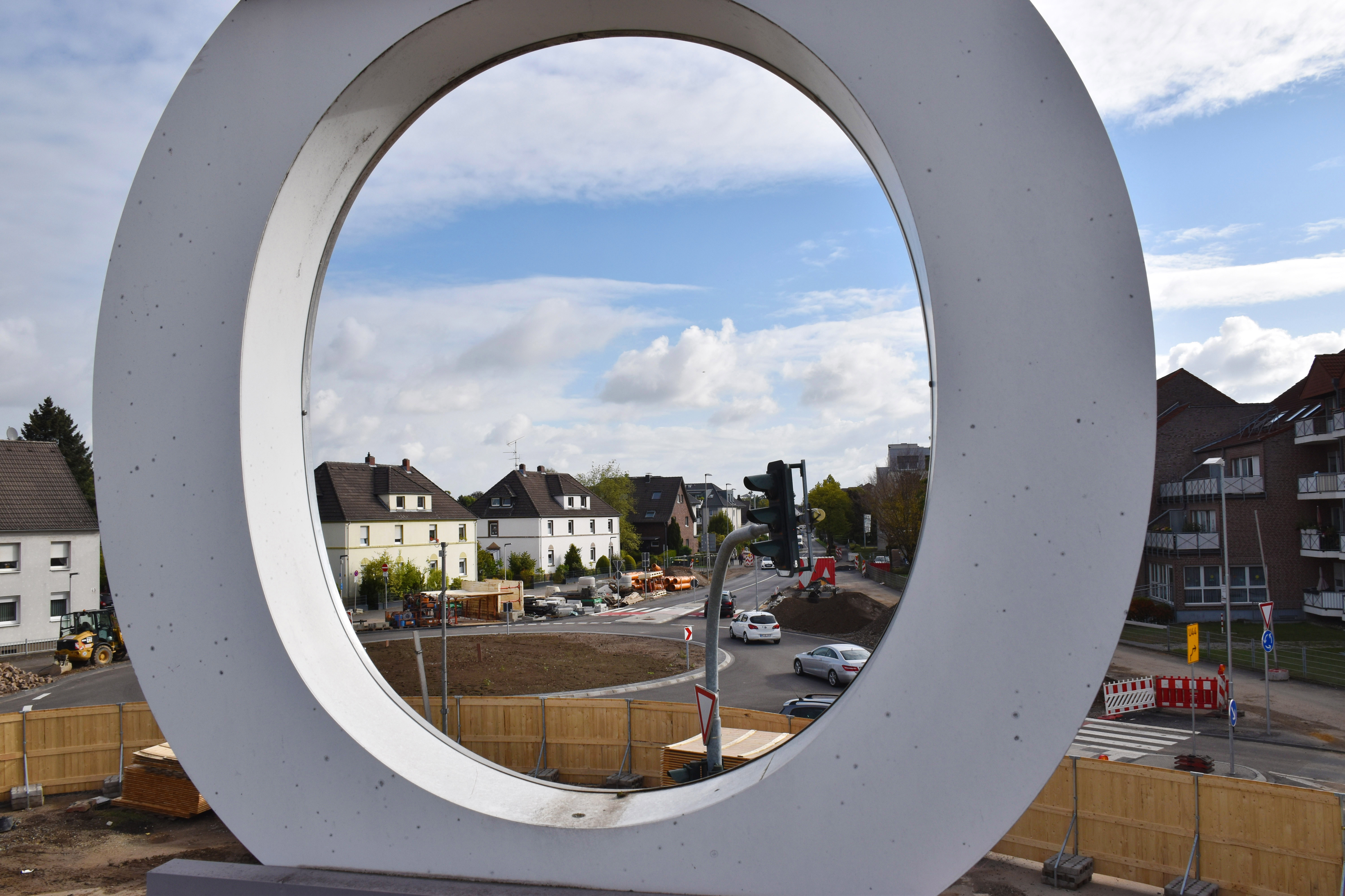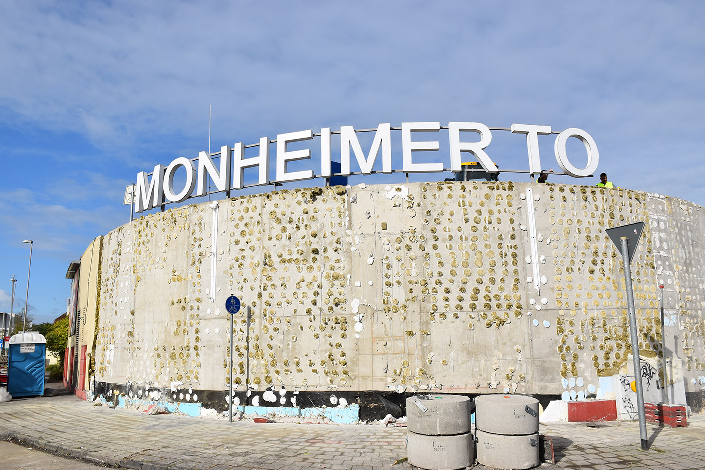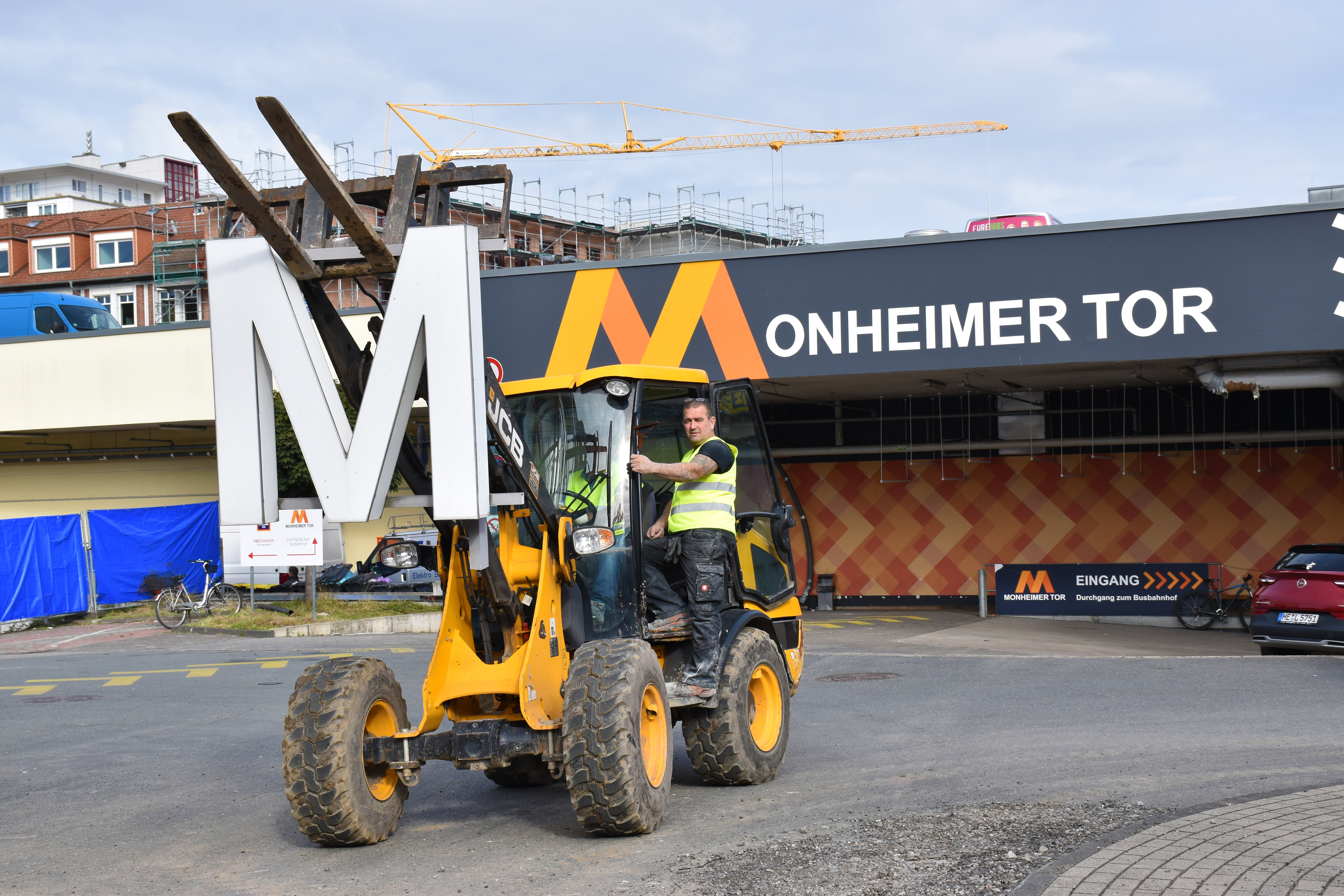 Symbolkraft besaß in dem Zusammenhang die Demontage der ersten Buchstaben des alten Schriftzugs „Monheimer Tor“ in Richtung Opladener Straße. Denn hier beginnen die Abbruchtätigkeiten. Um Platz für die Baugrube und das neue Hotel zu schaffen, werden zunächst einige Rückräume des Edekamarkts abgerissen. Ein Bauzaun markiert und sichert diesen Bereich ab. Die Durchfahrt durch den jüngst freigegeben neuen Kreisverkehr bleibt jedoch bestehen, auch Fußgängerinnen und Fußgänger können weiterhin am Berliner Ring um das Monheimer Tor herumlaufen.