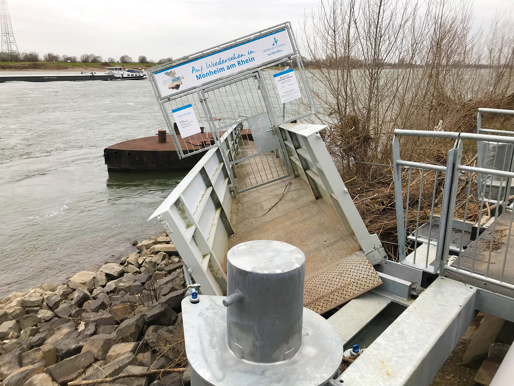 Die durch die Stadt gerade erst neu installierte Schiffsanlegestelle in Baumberg ist in von einem Schiff gerammt worden und hat nun mächtig Schlagseite.