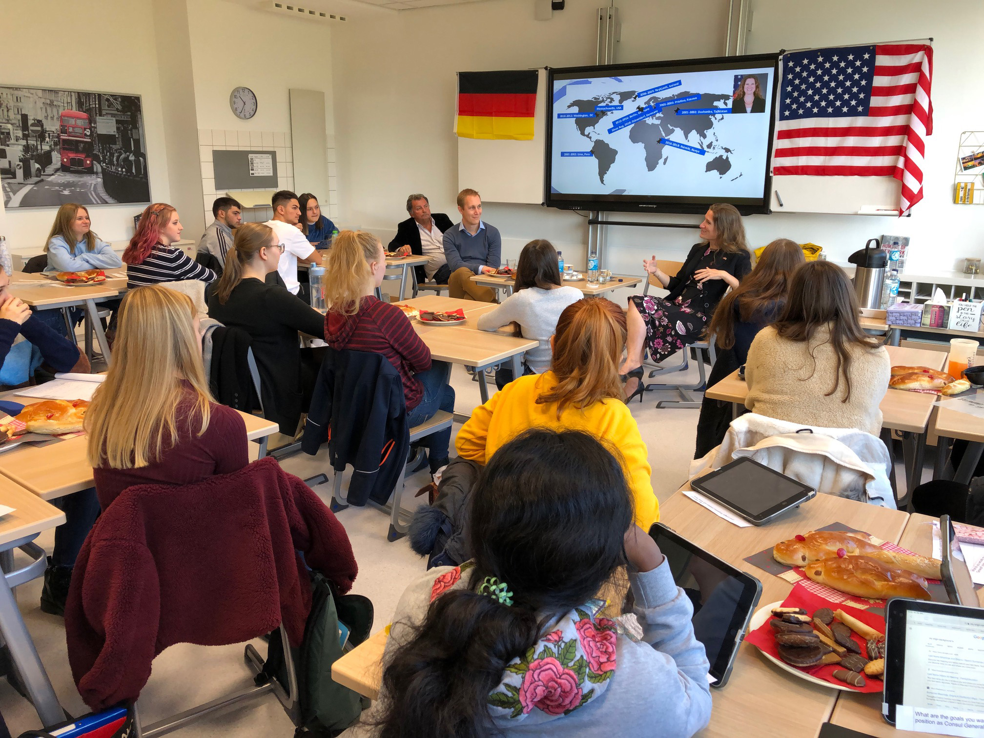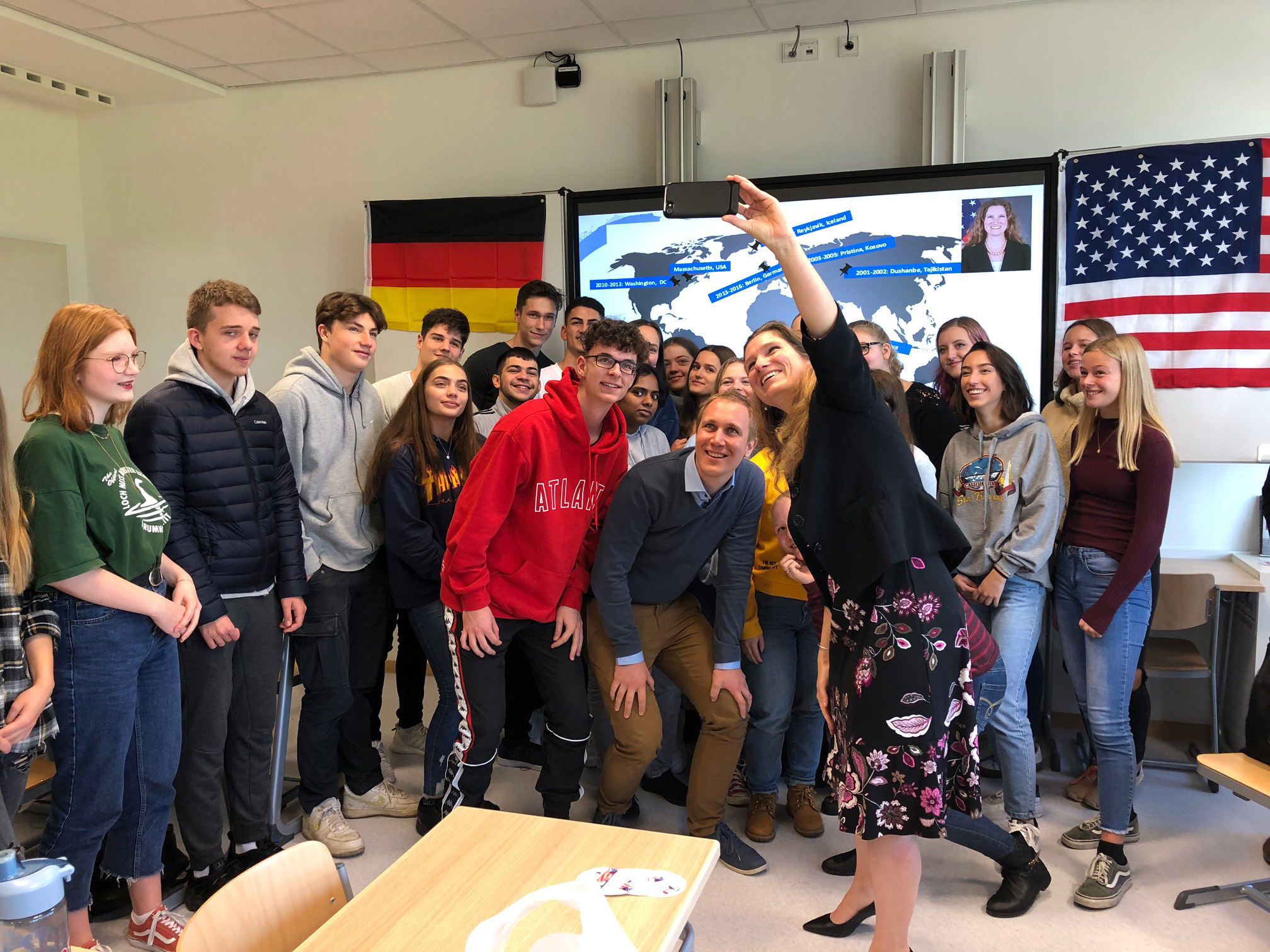 Der Austausch mit den interessierten Schülerinnen und Schülern am OHG beeindruckte Fiona Evans sehr. Über eine Stunde lang beantwortete die Generalkonsulin ebenso gerne wie geduldig persönliche und politische Fragen. Wie lebt es sich, wenn man als Diplomatin mit seiner Familie immer wieder den Wohnort und sogar das Land wechseln muss? Was sagen die Kinder, wenn man nach jeweils drei Jahren in Kenia, Berlin und Russland nun in Düsseldorf zur Schule geht? Wie steht es um die Haltung der Generalkonsulin zu den amerikanischen Waffengesetzen? Wie fällt die Beurteilung des Gesundheitssystems in ihrer Heimat aus? Evans blieb keine Antwort schuldig und lobte im Nachgang nicht zuletzt auch die hervorragend ausgebildeten Englischkenntnisse an Monheims Europaschule.