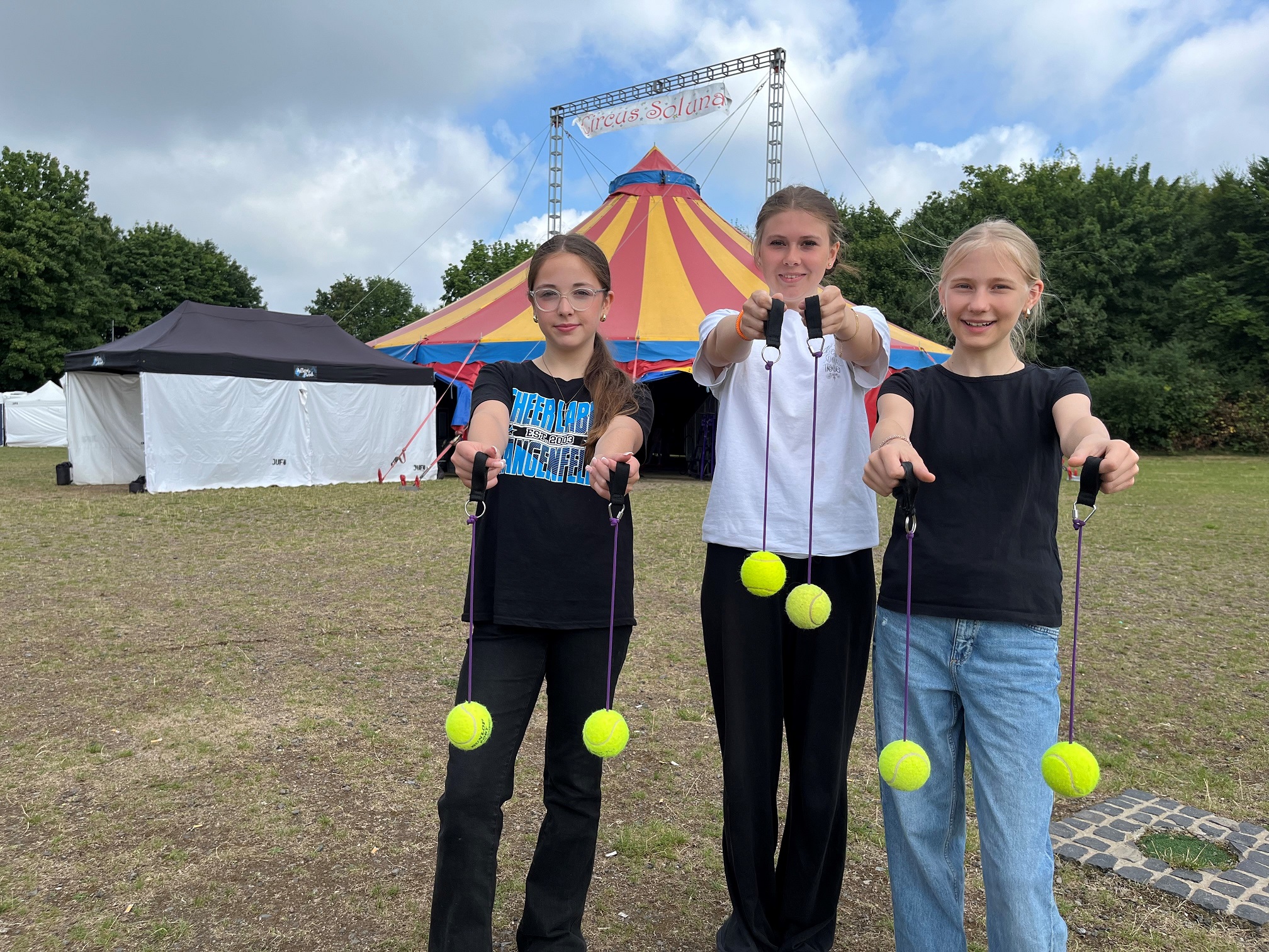 Gleichzeitig ist der Zirkus ein nachhaltiger Kreislauf. Viele Teammitglieder haben selbst als Kinder bei der Ferienaktion mitgemacht und sind als Anleiterinnen und Anleiter geblieben, unterstützen zum Beispiel während des Studiums. So beispielsweise die 16-jährige Jarla, die erstmalig als Jugendhelferin mit an Bord ist. „Mir macht es großen Spaß, die Workshops zu betreuen und dabei mit den Kindern und Jugendlichen zusammen zu sein“, berichtet die Schülerin, die ihre Ferienzeit gerne auf der Baumberger Bürgerwiese verbringt. Den beiden Freundinnen Paulina (12) und Lina (13) bringt sie beispielsweise dem Umgang mit den Pois bei. „Das sind Bälle, die an einem Gummiseil hängen und mit denen man Kunststücke aufführen können“, erklären die beiden Schülerinnen, die sich schon auf den großen Auftritt vor Familie und Freunden freuen. „Ein bisschen nervös sind wir trotzdem“, geben sie wieder.