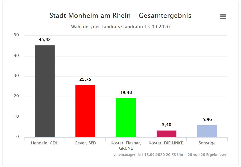 Die Landratswahl ist ausgezählt. Das vorläufige Monheimer Endergebnis lautet hier: Thomas Hendele (CDU) 45,42 Prozent (CDU) vor dem Monheimer Jens Geyer (SPD) 25,75 %, Martina Köster-Flashar (Grüne) 19,48 %, Rainer Köster (Die Linke), 3,40 %, Thomas Küppers (Piraten) 3,39 % und Mario Sülz (UWG-ME) 2,57 %.