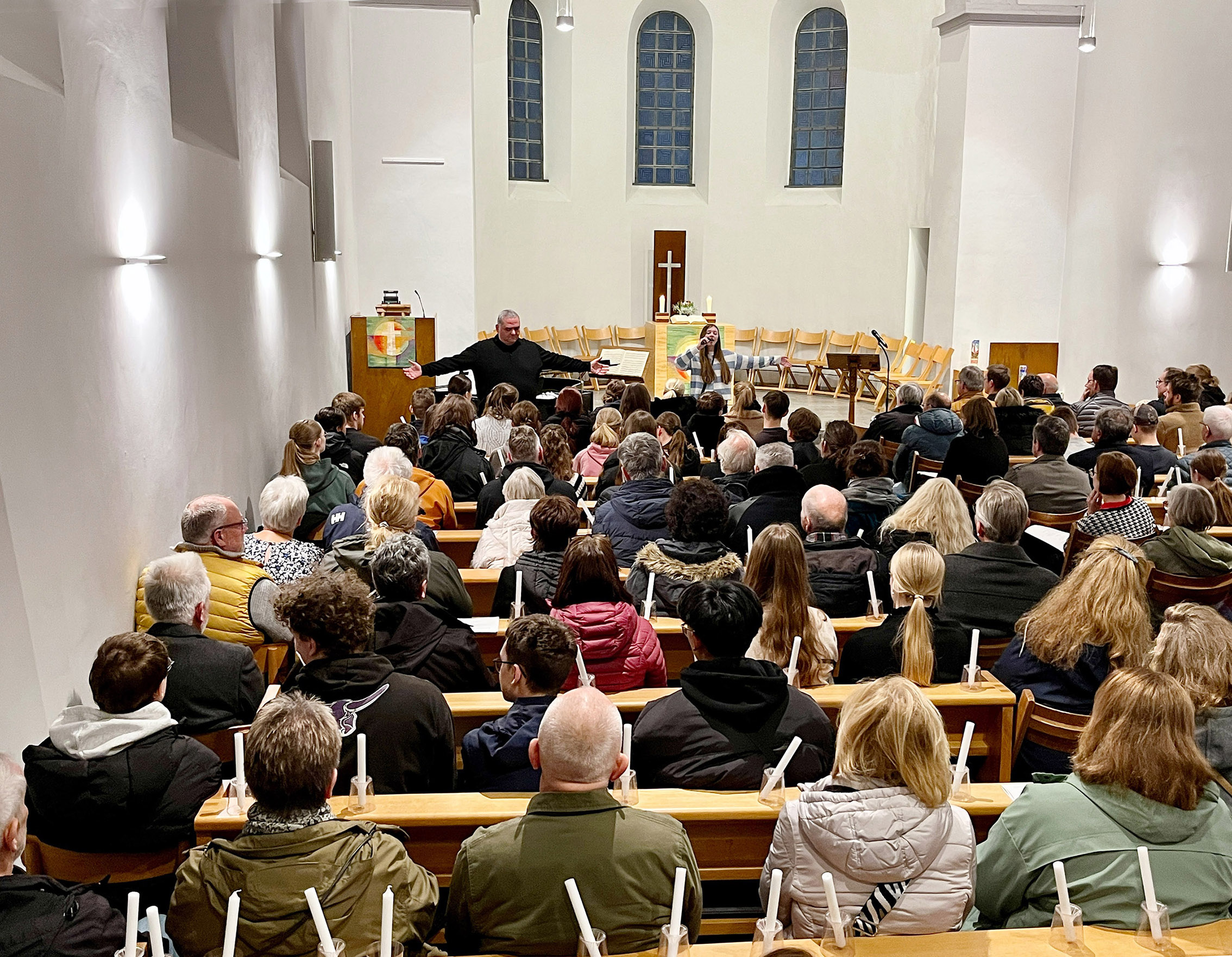 Erinnert wurde unter anderem an das Schicksal der beiden polnischen Zwangsarbeiter Stefan und Boleslaw Urbaniak. Zudem lasen Schülerinnen und Schüler aus dem Buch der Holocaust-Überlebenden Margot Friedländer im Gespräch mit Sabine Leutheusser-Schnarrenberger, bevor Leonard Cohens durch OHG-Schülerin Nicole Ponsa und Alexander Schaefer großartig vorgetragenes „Halleluja“ in der stillen Kirche erklang.