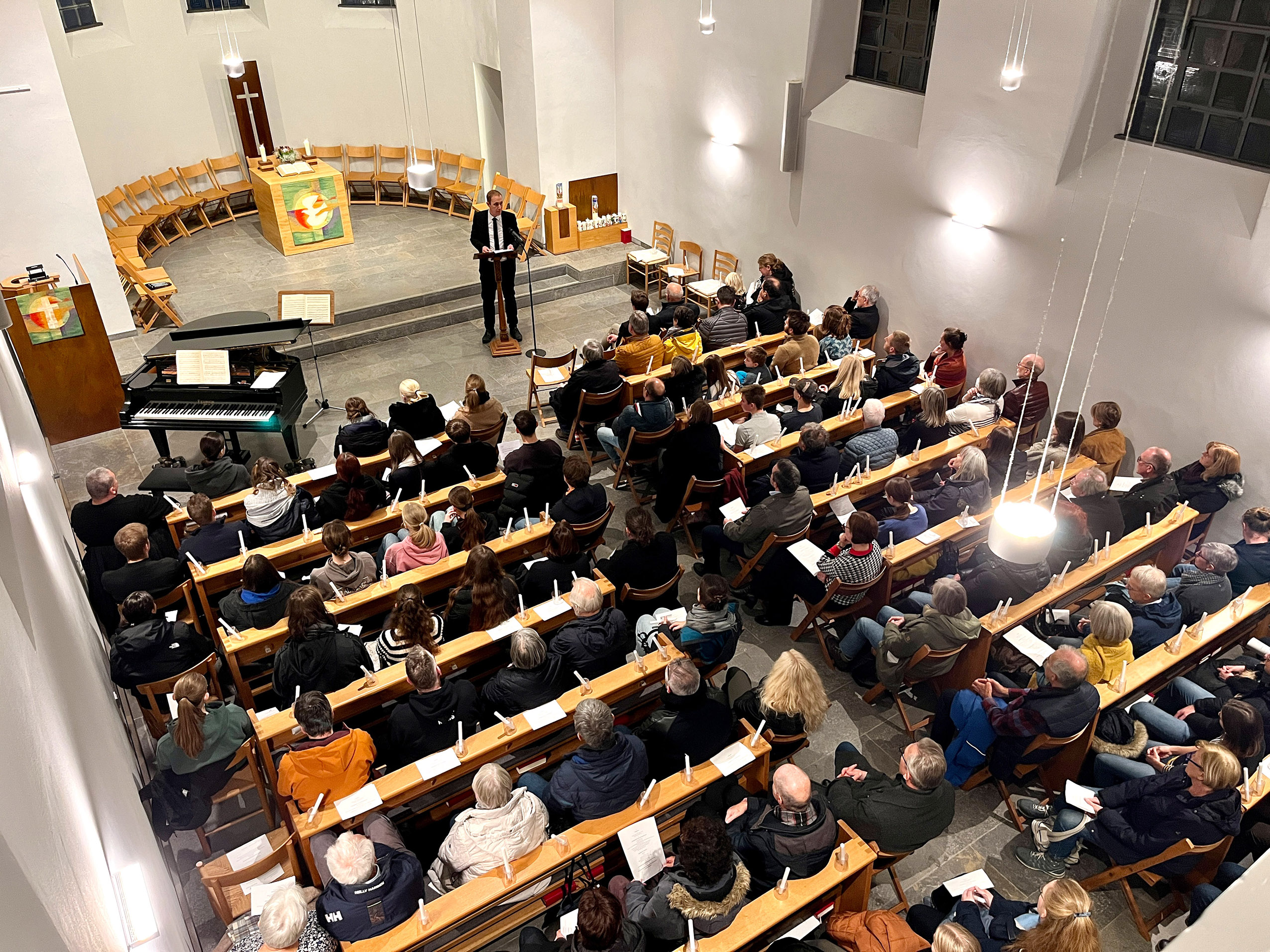 In der Altstadtkirche betonte auch Pfarrer Malte Würzbach das „Nie wieder“ sowie die Wichtigkeit der Zusammenkunft und konnte sich über eine bemerkenswert volle Kirche freuen, in der nicht nur viele junge Monheimerinnen und Monheimer zum Programm beitrugen, sondern auch in den voll besetzten Bankreihen und auf der ebenfalls mitgefüllten Empore Platz genommen hatten, um ein Zeichen zu setzen.