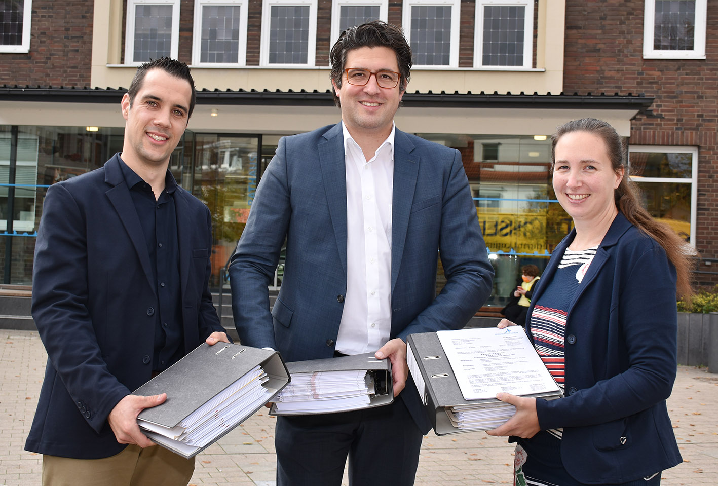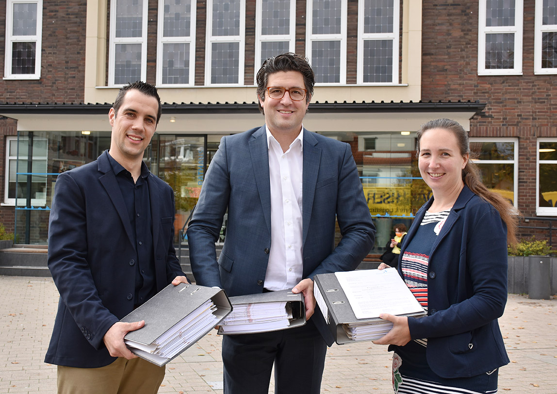 Am Freitag, 5. November, konnten die städtische Beigeordnete Lisa Pientak, die zugleich auch Leiterin des Bereichs Stadtplanung und Bauaufsicht ist, gemeinsam mit Niklas Janczyk aus dem Bauaufsichtsteam dem Intendanten und Geschäftsführer der Monheimer Kulturwerke, Martin Witkowski, die formale Baugenehmigung für das ambitionierte Projekt überreichen.