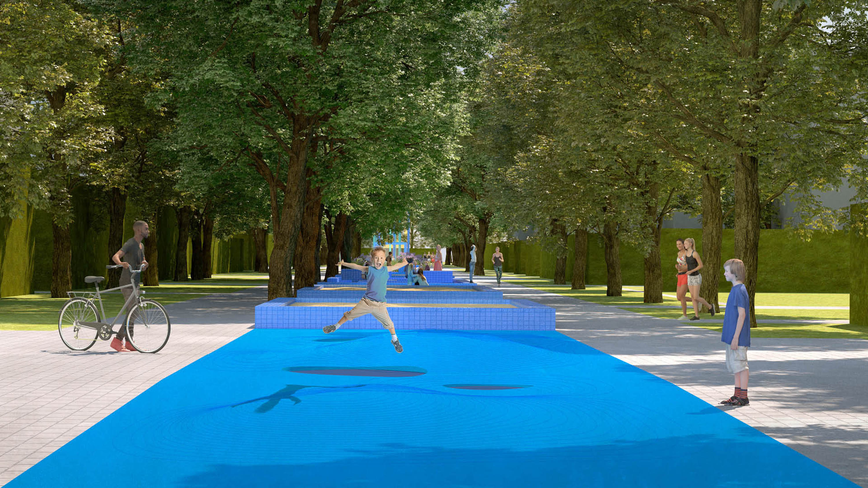 Wie die seit diesem Montag öffentlich einzusehende Beschlussvorlage erläutert, sind für die künstlerische Umgestaltung der Allee verschiedene Becken vorgesehen, die aus Wasservorhängen befüllt werden. Die Wasserbecken werden begehbarsein. Das heißt Kinder – und natürlich auch Erwachsene – werden darin spielen oder auch einfach nur die Füße ins Wasser baumeln lassen können. Die zwei Bereiche an den beiden Enden der Brandenburger Allee, die mit den Wasserspielen gestaltet werden, sollen durch einen Mittelteil unterbrochen werden, der als Spielplatz- und Aufenthaltszone gestaltet wird. Als Material will Alicja Kwade sowohl für die Becken als auch für die Rahmen und Sitzbereiche besondere Fliesen aus Mexiko verwenden, die in besonders kräftigen, changierenden Blautönen als Reminiszenz an den Rhein ein blaues Band durch das Berliner Viertel legen.