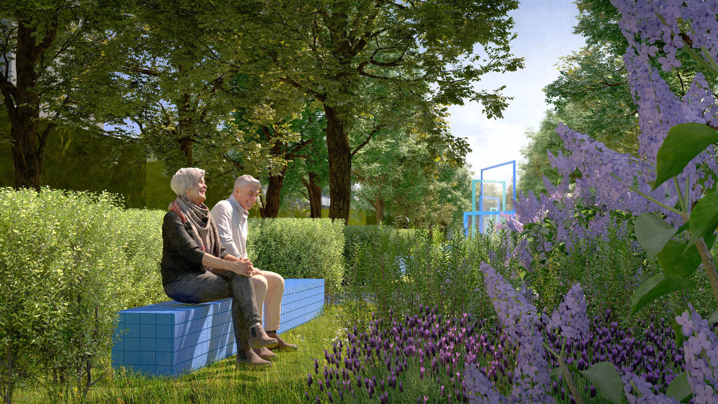 Im Konzept wird erläutert: In den Wasservorhängen werden je nach Lichtstimmung unterschiedliche Naturphänomene wie Lichtbrechung und Überlagerungseffekte betont. Die Rahmen sollen die Umgebung einfangen und im übertragenen Sinne Ausschnitte der Welt schaffen – wie Momentaufnahmen der Zeit. Je nach Standpunkt werden die künftigen Betrachterinnen und Betrachter die Rahmen dann ineinander verschachtelt und verwinkelt sehen. Durch die Bewegung des Betrachters in Zeit und Raum wird die Installation selbst animiert und schafft ein filmisches Moment. „Das blaue Band“ schärft die Wahrnehmung unserer Umwelt und das Bewusstsein für Zusammenhänge, Kreisläufe und den Umgang mit lebenswichtigen Ressourcen unseres Planeten wie dem Wasser.