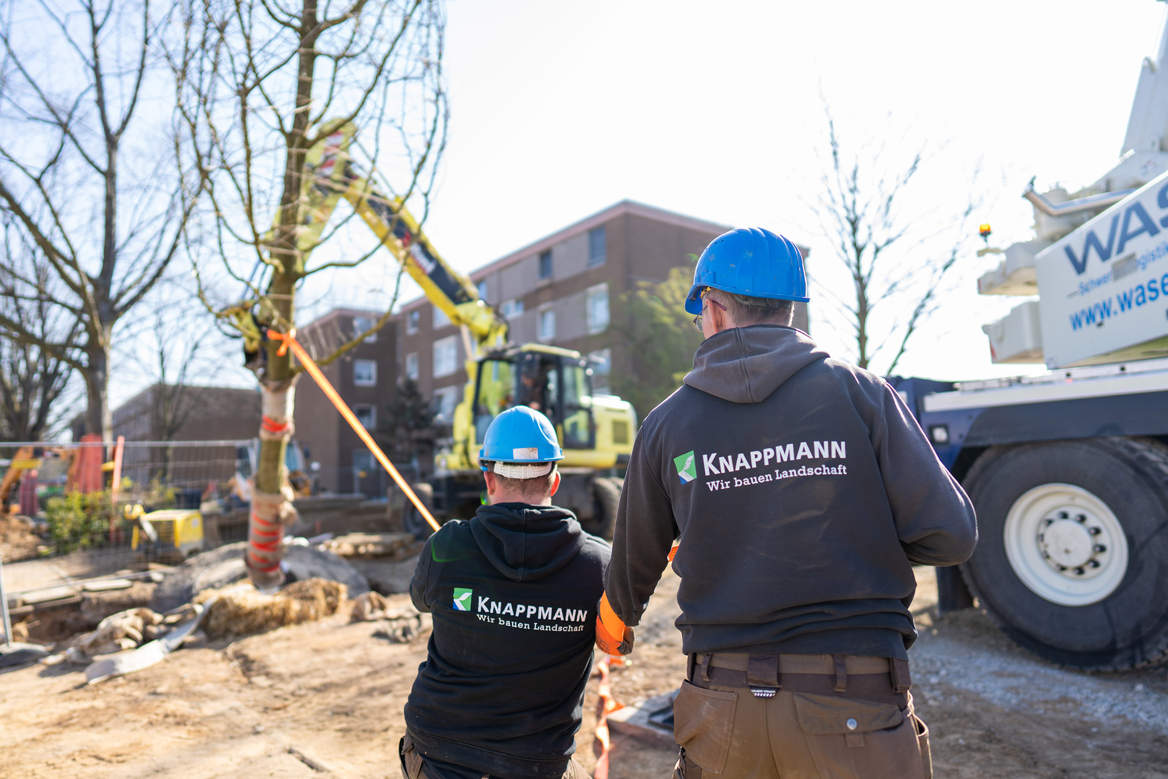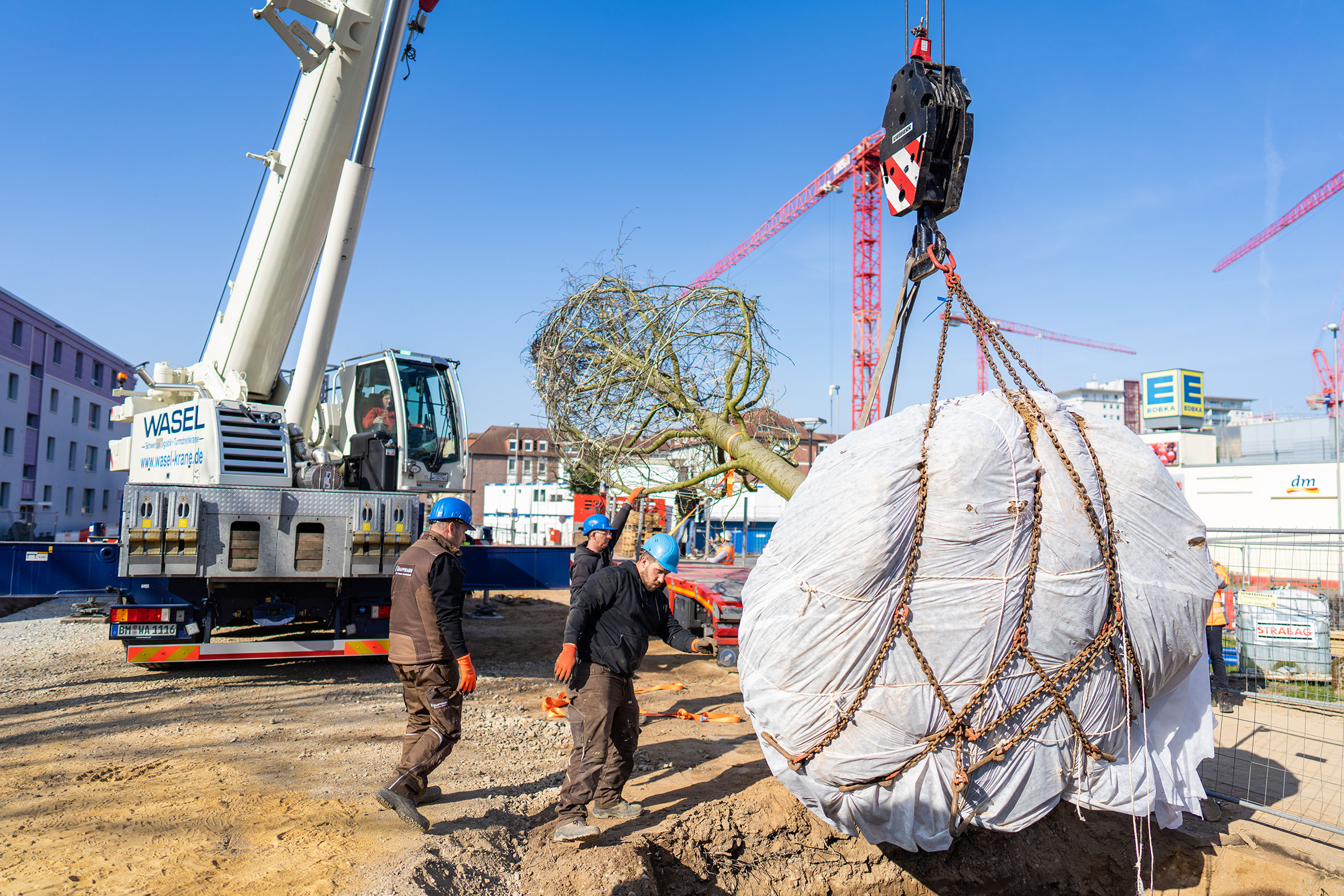 Im Februar mussten am neuen Verflechtungsband zwischen Monheimer Tor und Berliner Viertel drei Eichen gefällt werden, die man inmitten der Großbaustelle eigentlich als platzprägende Stadtbäume unbedingt erhalten wollte. Erst bei den Straßenarbeiten, die um die Bäume herumgeführt werden sollten, wurde klar, dass die Eichen zu flach gewurzelt hatten. Sie mussten aus Gründen der Standsicherheit gefällt werden. Sofort war man sich einig: Es muss Ersatz her, der an dieser Stelle auch sofort richtig zur Geltung kommt – sehr großer Ersatz also.