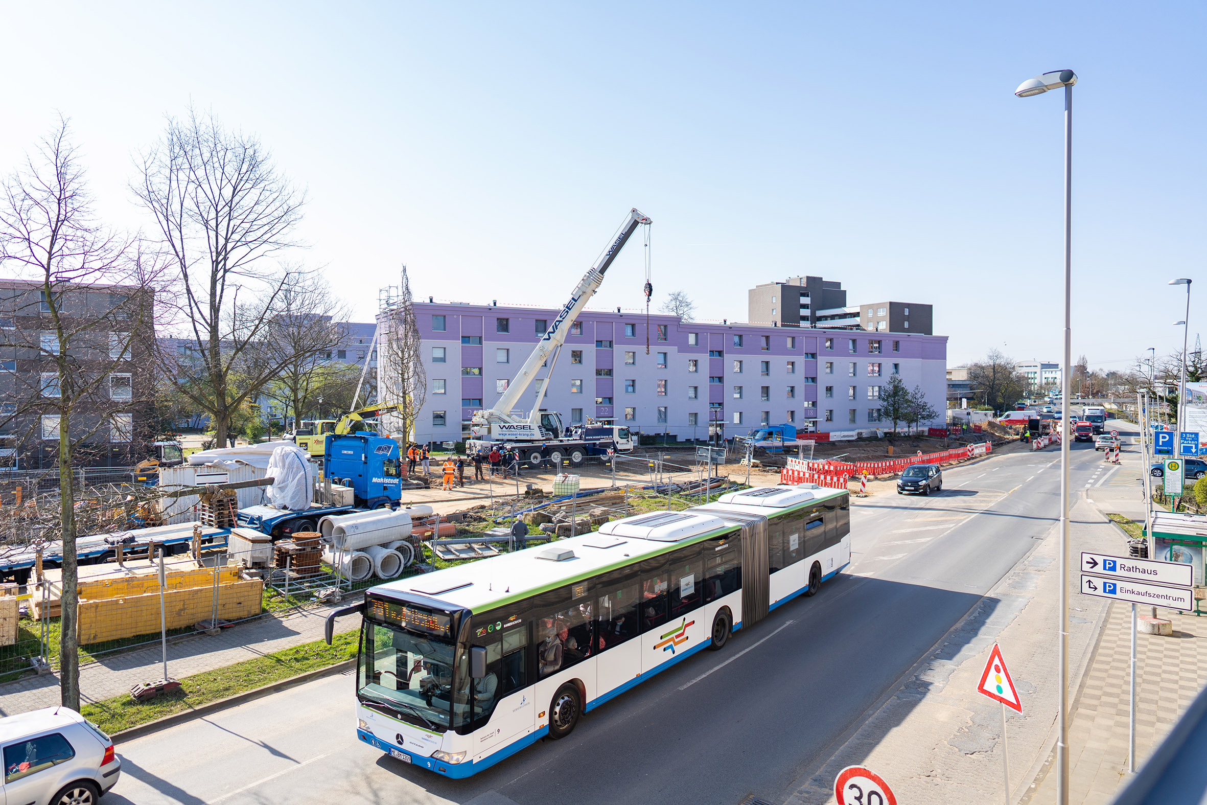 Und der ist nun da. Die ersten beiden von insgesamt fünf neuen Eichen mit einem Stammumfang von fast knapp einem Meter und einer Kronenhöhe von bereits jetzt rund zehn Metern sind an diesem Dienstag eingetroffen und durch ein Spezialunternehmen eingesetzt worden. Die fünf neuen Großbäume lässt sich die Stadt rund 100.000 Euro kosten. Sie werden in diesen Tagen einzeln auf Tiefladern aus Norddeutschland angeliefert und in einen speziell für sie aufbereiteten Boden inklusive Bewässerungssystem gesetzt. Damit sind sie fit für die kommenden Jahrzehnte und eine mit Blick auf den Klimawandel gewiss nicht immer leichte Zukunft. „Durch unsere Ursprungsplanungen für den Baumerhalt haben wir unter anderem eine begrünbare Mittelinsel von über sechs Metern bekommen, die wir jetzt gestalten können – mit den größten Bäumen, die die Stadt je angeschafft hat“, betont Straßenbau-Ingenieur Michael Thiemann.