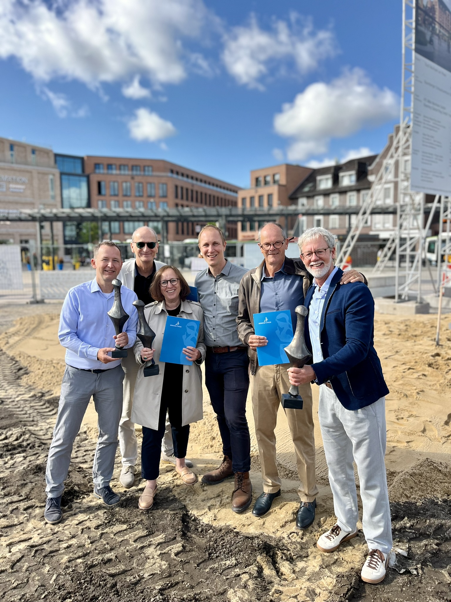 In Richtung der Geehrten hob Zimmermann hervor, wie wichtig es gewesen sei, den gemeinsamen Fokus auf das Wesentliche nie aus den Augen verloren zu haben: „Wir haben hier eine Innenstadt vor allem für den Einzelhandel und die Gastronomie entwickelt – in logischer Folge damit natürlich auch für die Bürgerinnen und Bürger. Aber es ist ein ganzheitliches Konzept, das wir an diesem besonderen Ort verfolgen und es ist wichtig, dass wir konsequent gehandelt haben und nicht etwa Stimmen gefolgt sind, die hier alles gleich mehrere Nummern kleiner, grüner oder gar direkt einen ganzen Stadtpark haben wollten. Wir alle, so wie wir hier stehen, wissen: Das hätte nicht funktioniert. Unweit von uns gibt es den Rheinbogen, den Knipprather Wald und viele weitere attraktive Grün- und Naherholungsflächen. Aber mitten in unserem Zentrum, in Monheim Mitte, haben wir tatsächlich richtigerweise vor allem die Interessen des Einzelhandels in den Mittelpunkt gerückt. Der braucht Flächen und gewissen Größen. Dann funktioniert auch die Innenstadt. Auf diese Weise wird sie so lebendig und so attraktiv für die Menschen, wie wir sie hier heute schon erleben.“ Gleichzeitig betonte Zimmermann: „Auch der 3. Bauabschnitt wird nicht der Schlussakkord für die gesamte Innenstadt sein. Handel wird sich immer verändern und verändern müssen. Deshalb muss auch eine Innenstadt immer wieder neu angepasst werden, damit sie floriert und für die Menschen funktioniert.“ Neben den Merkur-Statuen als symbolisches Geschenk, gab es für die Preisträger auch die Baugenehmigung als entscheidende Zugabe.