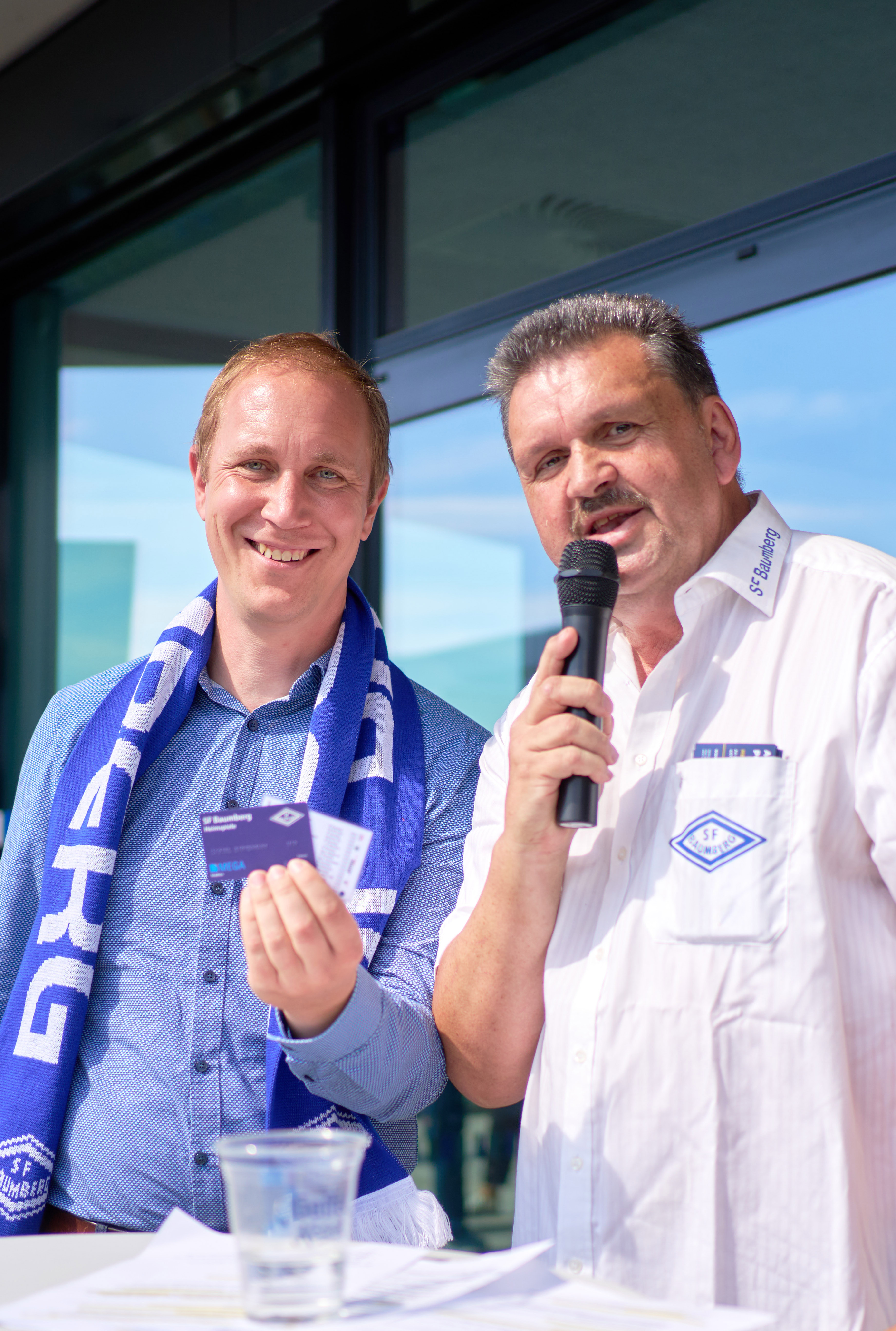 „Wir haben hier ein echtes Schmuckstück erhalten“, dankte der SFB-Vorsitzende Jürgen Schick in Richtung Stadt und Rat. Dabei sei die Zusammenarbeit, auch wenn es in der einzelnen Sache mal Diskussionen gegeben habe, immer konstruktiv gewesen. Schick: „Der ganze Stadtteil Baumberg ist im Ergebnis durch dieses Sportzentrum aufgewertet worden.“ Auch hob der oberste Sportfreund die Wichtigkeit hervor, nun zum Beispiel durch die bauliche Trennung von Heim- und Gästebereich auch sogenannte Sicherheitsspiele auf der heimischen Anlage durchführen zu können. Ein echter Mehrwehrt für den Verein – finanziell und atmosphärisch. Schick in Richtung des scheidenden Bürgermeisters Daniel Zimmermann: „Ich danke Ihnen auch persönlich. Von einem neuen Bürgermeister im Rathaus erhoffen wir uns hier in Zukunft die gleiche Unterstützung.“