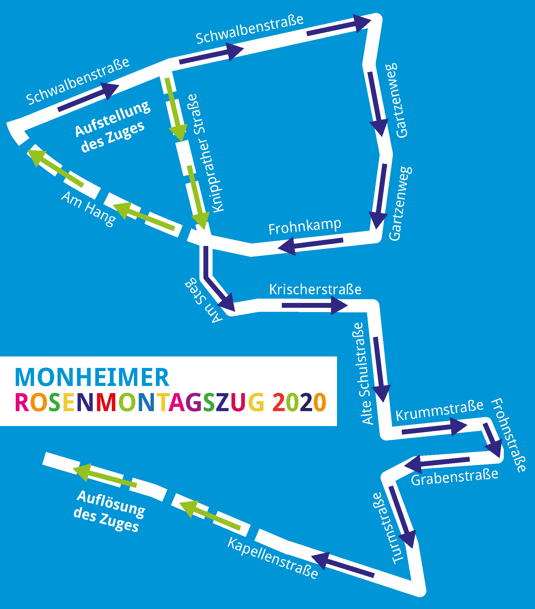 Am Nachmittag macht sich ab 14.11 Uhr der 26. Monheimer Kinderkarnevalszug mit Prinzessin Paula und Prinz Marlon auf den Weg durch die Altstadt. Aufstellung und Auflösung ist hier auf der Biesenstraße. Von dort geht es über die Kirchstraße am Schelmenturm vorbei über Frohnstraße, Krummstraße und Alte Schulstraße zurück zur Poststraße.