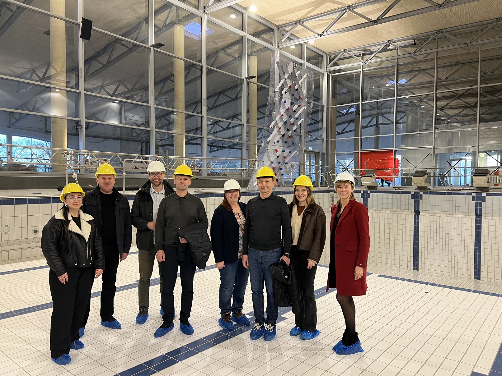 Im Schul- und Sportbüro informierten sich die Gäste über die Organisation der städtischen Sporthallen, über die Zusammenarbeit mit Schulen und Vereinen sowie über Kursangebote und Abläufe im täglichen Betrieb. Anschließend besichtigte die Delegation die Achtfachsporthalle, bevor am Nachmittag eine ausführliche Führung über die Baustelle des Mona Mare folgte. Gemeinsam mit Fachleuten der Stadt und mit Unterstützung von Mona-Mare-Betriebsleiterin Vanessa Boy ergaben sich dabei intensive Gespräche über die Modernisierung kommunaler Bäder, technische Anforderungen und langfristige Entwicklungsstrategien.