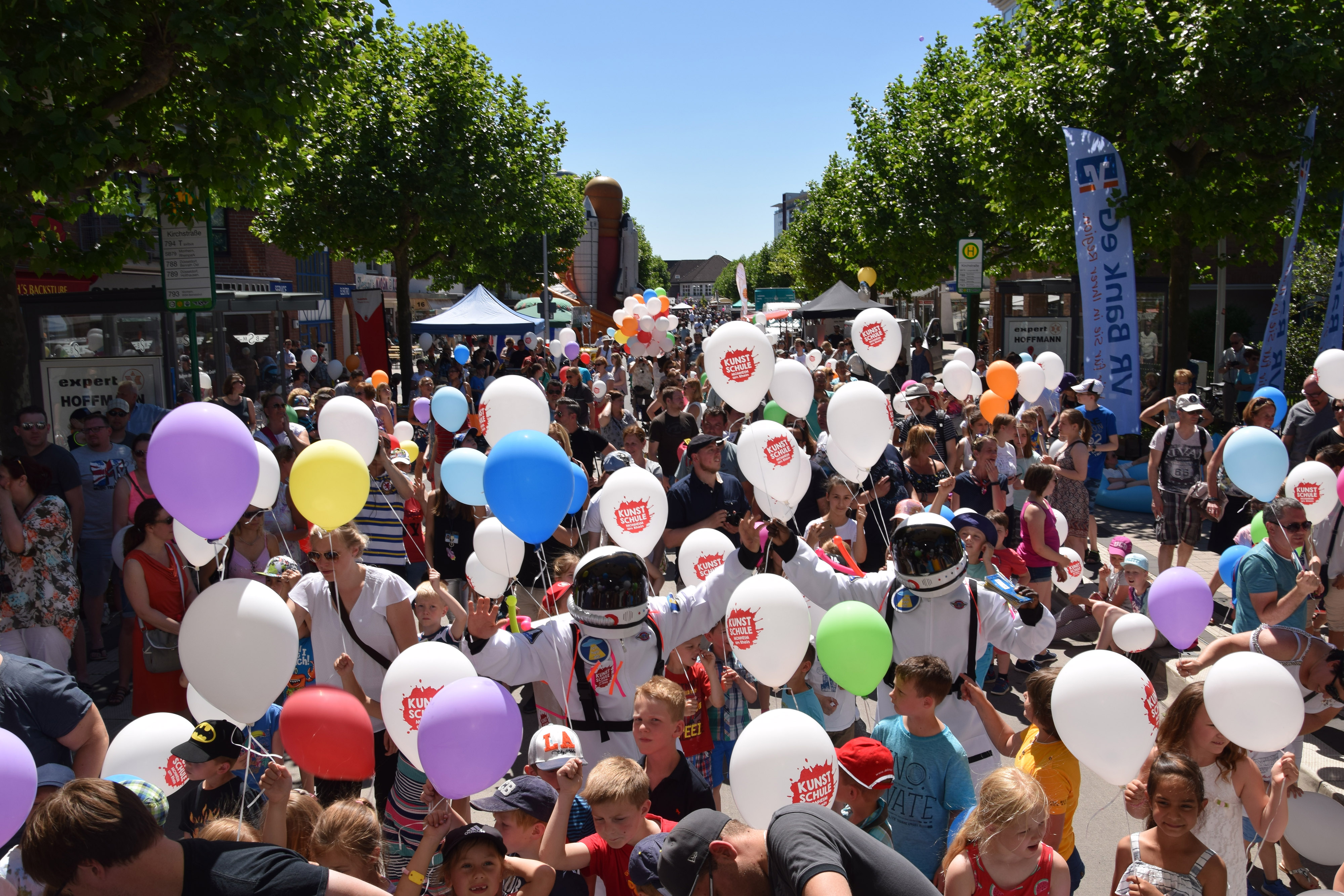 Passend zum diesjährigen Stadtfest-Motto „Einmal Weltraum und zurück“ hatten rund 1500 Kinder in Monheims Kindertagesstätten und Grundschulen gemeinsam mit den Dozentinnen und Dozenten der städtischen Kunstschule glitzernde Raumkapseln und viele weitere galaktische Dinge gebastelt, die beim Stadtfest zwei Tage lang in einer großen Freiluftausstellung auf der Krischerstraße bewundert werden konnten.