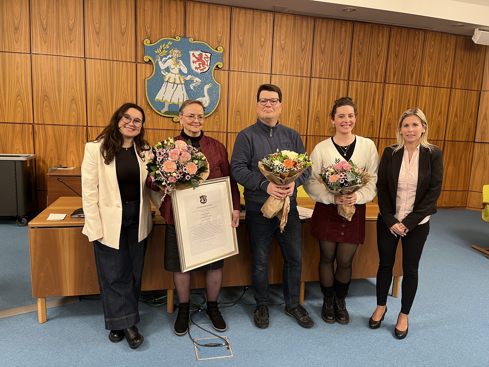 Getragen wird die Nachhilfegruppe nicht nur von der Initiatorin selbst, sondern auch von einem breiten Netzwerk freiwillig Engagierter, die ihre beruflichen und fachlichen Kenntnisse einbringen. Ob aus naturwissenschaftlichen, sprachlichen oder handwerklichen Bereichen – die Vielfalt der Unterstützenden ermöglicht individuelle Förderung auf hohem Niveau. Besonders anrührend ist die Kontinuität, mit der sich viele der Ehrenamtlichen engagieren, sowie die Tatsache, dass ehemalige Teilnehmende heute selbst als Unterstützende zurückkehren. Auch bei der Preisverleihung wurde dieses Engagement sichtbar: Christian van den Boom und Julia Wieczorek, die mittlerweile zum festen Nachhilfeteam gehören, begleiteten Gabriele Oesten-Burnus zur Feierlichkeit und wurden ebenfalls von Bürgermeisterin Sonja Wienecke und Melissa Dilara Ergen mit Blumen und Danksagungen bedacht.