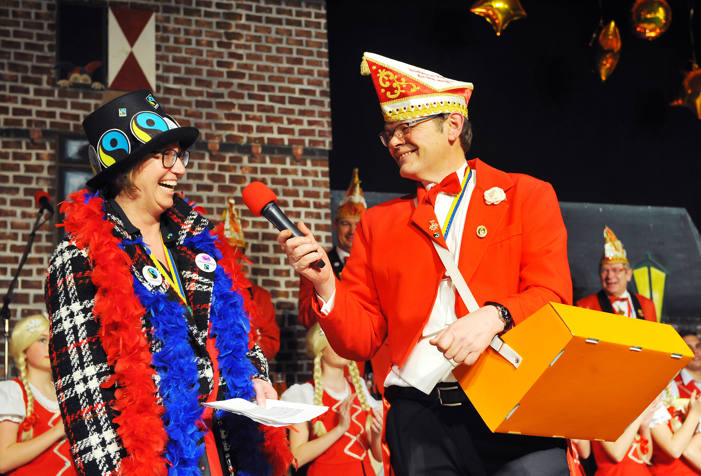 Einen Kamelleregen gab es am Abend der Prunksitzung auch gleich zu Beginn der Veranstaltung. Die Vertreter der Jecken Fairsuchung zogen gemeinsam mit den Monheimer Karnevalistinnen und Karnevalisten ein und warfen dabei faire Mango Monkeys und Fliegende Herzen im jecken Stadtdesign ins Publikum. Begleitet wurden sie von Ulrike Thönniges vom Verein „Tatort – Straßen der Welt e.V.“. Die Organisation unterstützt seit zwanzig Jahren den Handel mit fairen Mangofrüchen auf den Philippinen und macht sich dort damit auch für Kinderrechte stark. Martin Klupsch vom Fair-Handelszentrum Rheinland, das die Stadt mit der fairen Kamelle beliefert, begleitete die Delegation der Jecken Fairsuchung ebenfalls.