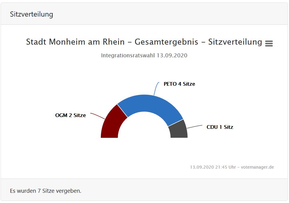 Diesmal haben 2.381 Monheimerinnen und Monheimer von ihrem Wahlrecht Gebrauch gemacht und damit 7 von 13 Sitzen im neuen Integrationsrat in direkter Wahl besetzt, davon gehen vier an die Peto, zwei an die Liste Osman-Gazi-Moschee und einer an die CDU. Die weiteren sechs Mitglieder werden aus dem Rat heraus entsandt. (ts)