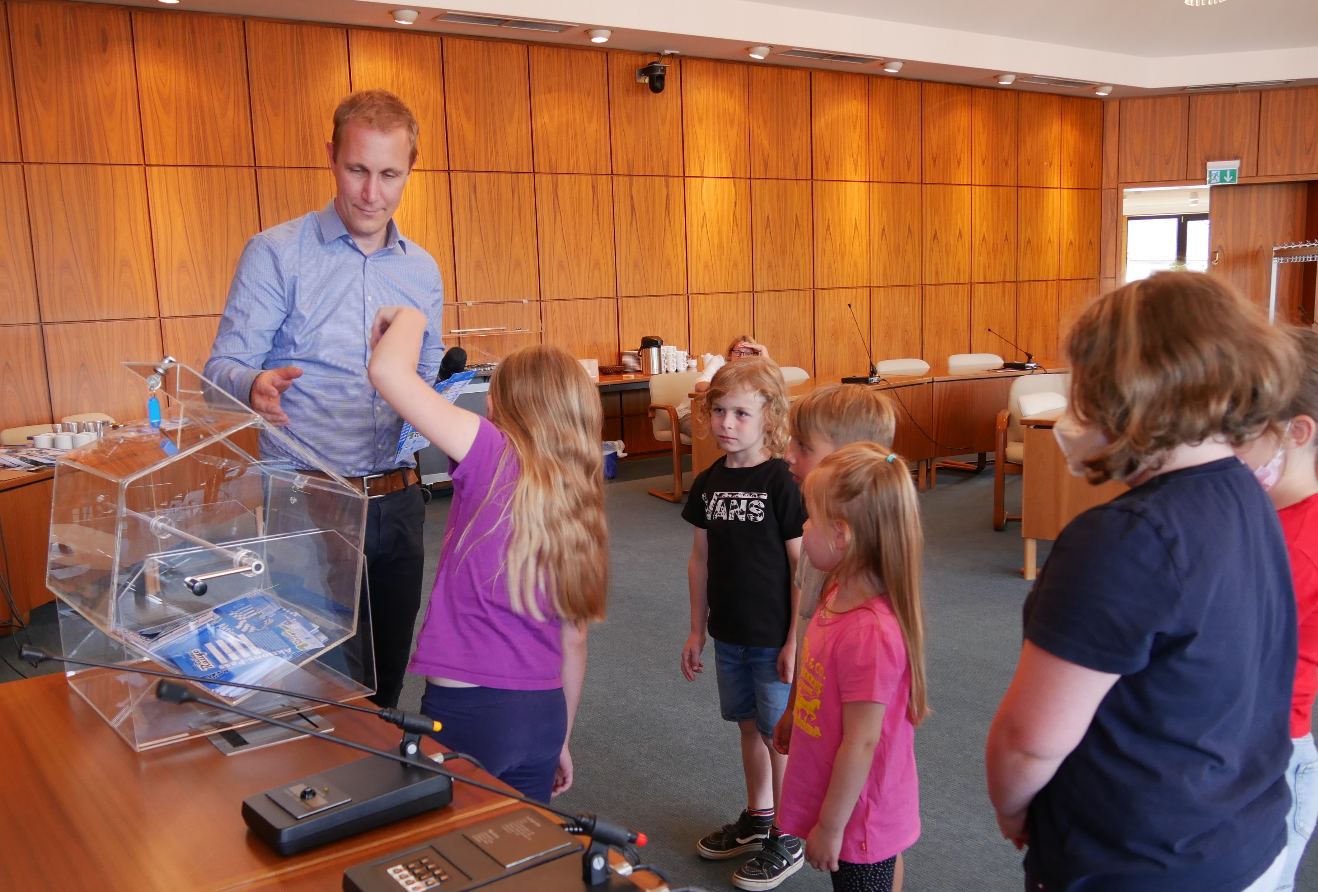 Ratternd dreht sich die Lostrommel im Ratssaal. Sie durchmischt circa 400 Aktionspässe von Teilnehmenden der Rathausrallye. Gespannt warteten am Dienstagnachmittag Kinder, Eltern, Lehrer, Erzieherinnen und Vereinsmitglieder darauf, ob ihr Projekt den Zuschlag von 500 Euro bekommt.