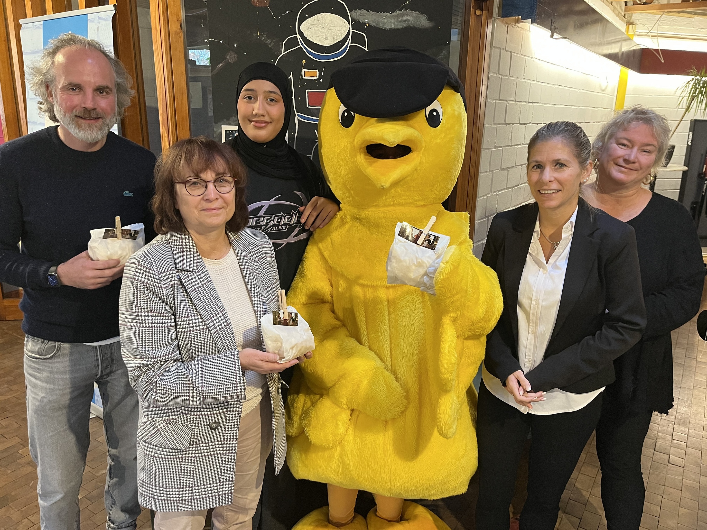 Am zweiten Tag der Kinderkinowoche war zudem Katharina Trautmann, Vorsitzende des Freundeskreises Goldener Spatz, zu Gast. Sie betonte, wie verbunden sie sich mit Monheim am Rhein und besonders mit dem Haus der Jugend fühlt, da sie seit nunmehr elf Jahren jedes Jahr zur Kinowoche kommt. „Hier wird das Thema wirklich gelebt, alles läuft strukturiert und gut organisiert ab und ich freue mich jedes Mal, wenn ich wieder hier sein darf“, betont sie. Als weiteren Ehrengast konnte die Kinogruppe Bürgermeisterin Sonja Wienecke gewinnen, die in ihrer Rede die anwesenden rund 130 Kinder der Ulla-Hahn-Gesamtschule und der Peter-Ustinov-Gesamtschule begrüßte und gleichzeitig dem Team für die super Vorbereitung dankte. „Man merkt direkt, dass es hier um Kino geht. Die Atmosphäre ist wirklich gelungen.“ Abschließend ließ es sich der Goldene Spatz nicht nehmen, den Kindern in Monheim am Rhein noch höchstpersönlich einen Besuch abzustatten und die Bühne anschließend für den Film freizugeben.