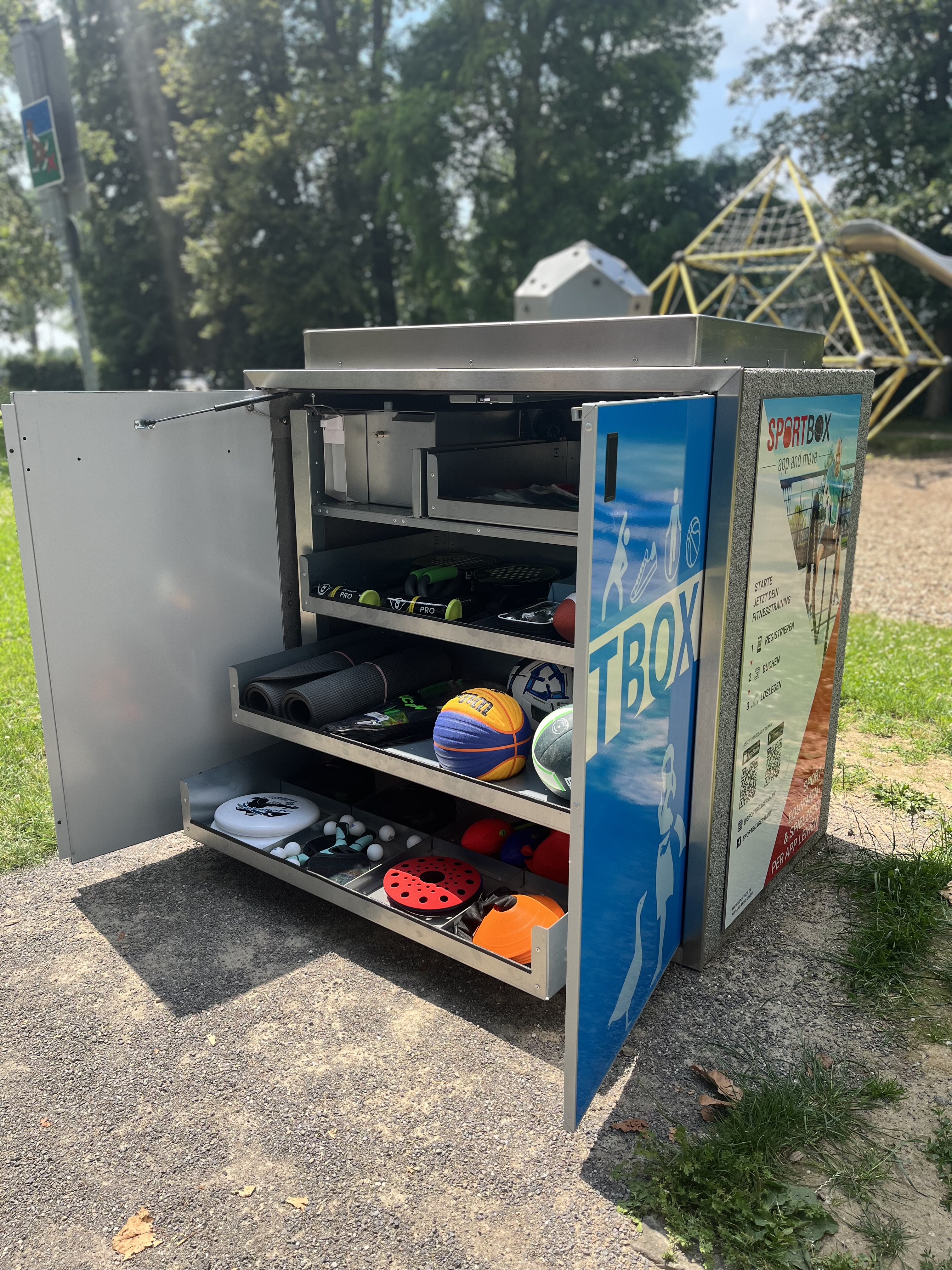 Die Ausleihe läuft aktuell über die Sportbox-App. Nach einer kurzen, kostenfreien Registrierung lässt sich ein Zeitfenster buchen und die Box anschließend direkt mit dem Smartphone öffnen. Eine Schritt-für-Schritt-Anleitung ist an jeder Box von außen angebracht. Möglich wurden die drei Standorte durch eine gemeinsame Initiative der städtischen Verwaltung und des Stadtsportverbandes Monheim am Rhein. Beide hatten nach Wegen gesucht, den öffentlichen Raum für Sportlerinnen und Sportler noch attraktiver zu machen – für Gelegenheitsbewegte genauso wie für Fitness-Fans.