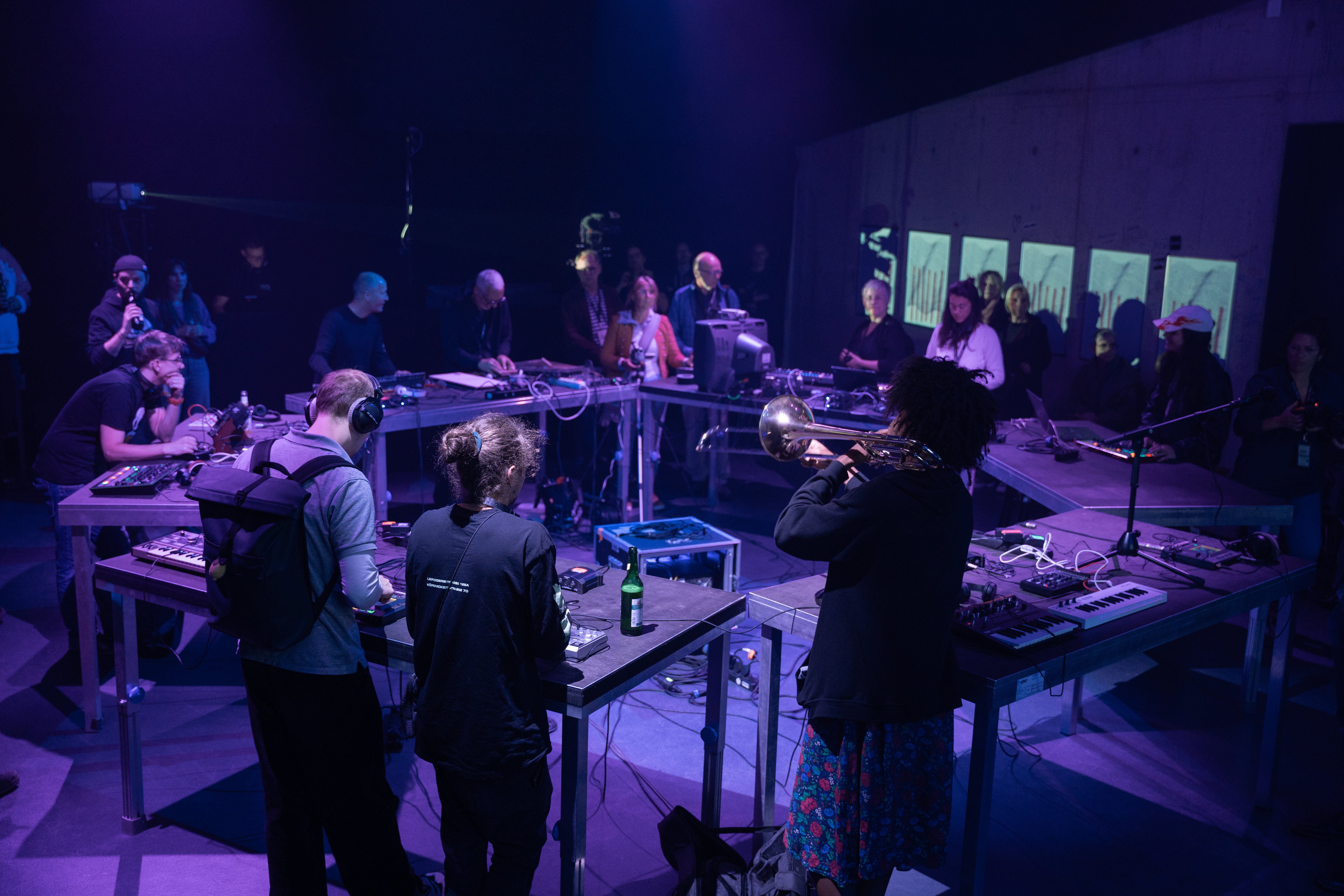 Bei der Musikmaschine stehen elektronische Klangerzeuger im Mittelpunkt. Verschiedene Geräte werden vor Ort bereitgestellt und können von allen Teilnehmerinnen und Teilnehmern ausprobiert werden. Nach einer ersten Experimentierphase entstehen meist spontane Ideen, die im zweiten Teil des Abends als gemeinsames Musikstück umgesetzt werden.