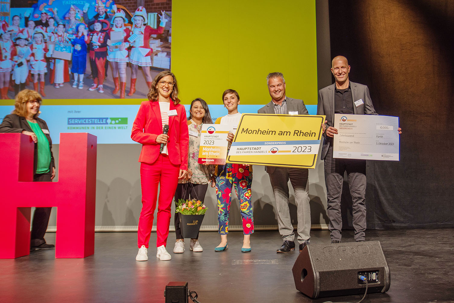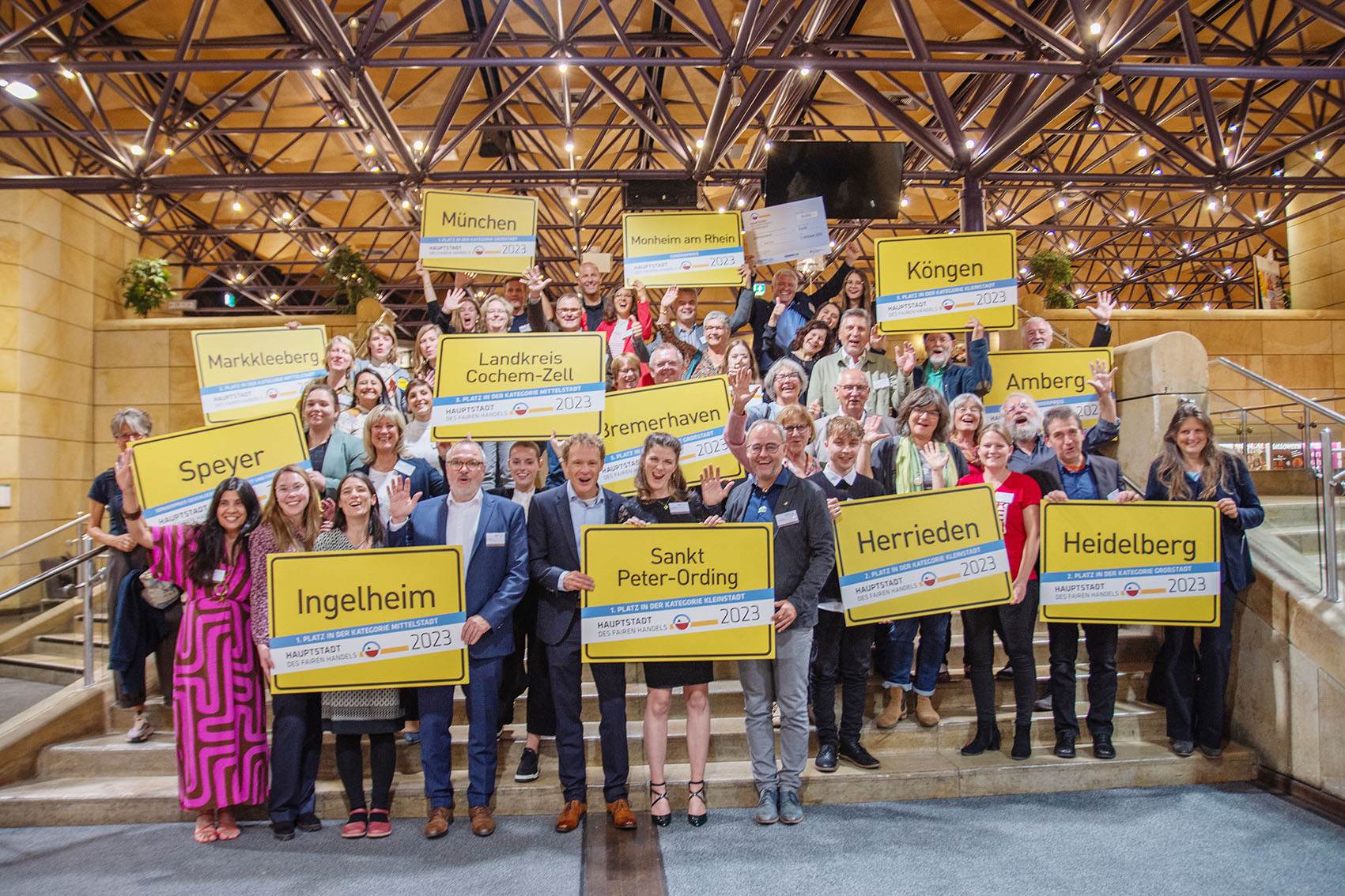 Insgesamt 13 deutsche Kommunen wurden im Beisein der Parlamentarischen Staatssekretärin im Entwicklungsministerium, Dr. Bärbel Kofler, im Rahmen einer feierlichen Preisverleihung am 5. Oktober 2023 im fränkischen Fürth geehrt, das 2021 selbst mit dem Titel Hauptstadt des Fairen Handels geadelt wurde. Seit 20 Jahren wird der Preis durch die Servicestelle Kommunen in der Einen Welt (SKEW) von Engagement Global im Auftrag des Bundesministeriums für wirtschaftliche Zusammenarbeit und Entwicklung (BMZ) an Städte und Gemeinden verliehen. Alle zwei Jahre wird damit herausgehobenes lokales Engagement von Kommunen im Themenfeld Fairer Handel und Faire Beschaffung ausgezeichnet.