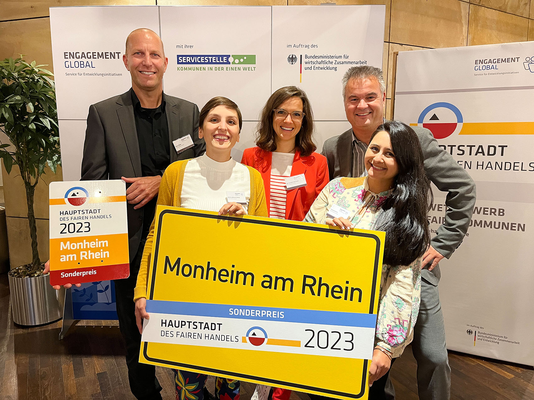Im Wettbewerb um den Preis „Hauptstadt des Fairen Handels“ werden alle zwei Jahre besonders kreative und wirkungsvolle kommunale Projekte rund um die Themen Fairer Handel und Faire Beschaffung gesucht und ausgewählt. Insgesamt 125 Kommunen aus allen 16 Bundesländern hatten beim 20-jährigen Jubiläum des Wettbewerbs Bewerbungen eingereicht, indem sie einer Fachjury immer eine Vielzahl von Einzelprojekten aus ihren Städten vorgestellt haben. Erstmals wurde der begehrte und in allen Kategorien mit einem Preisgeld versehene Hauptstadttitel 2023 dabei diesmal je an eine kleine, mittlere und große Kommune vergeben, gestaffelt nach ersten, zweiten und dritten Preisen. Zusätzlich wurden erstmalig auch ein Sonderpreis zum Thema „Geschlechtergerechtigkeit und Fairer Handel“ sowie ein Publikumspreis und eben auch zwei themenunabhängige Sonderpreise verliehen, bei denen das Monheimer Karnevalsengagement so begeisterte.
