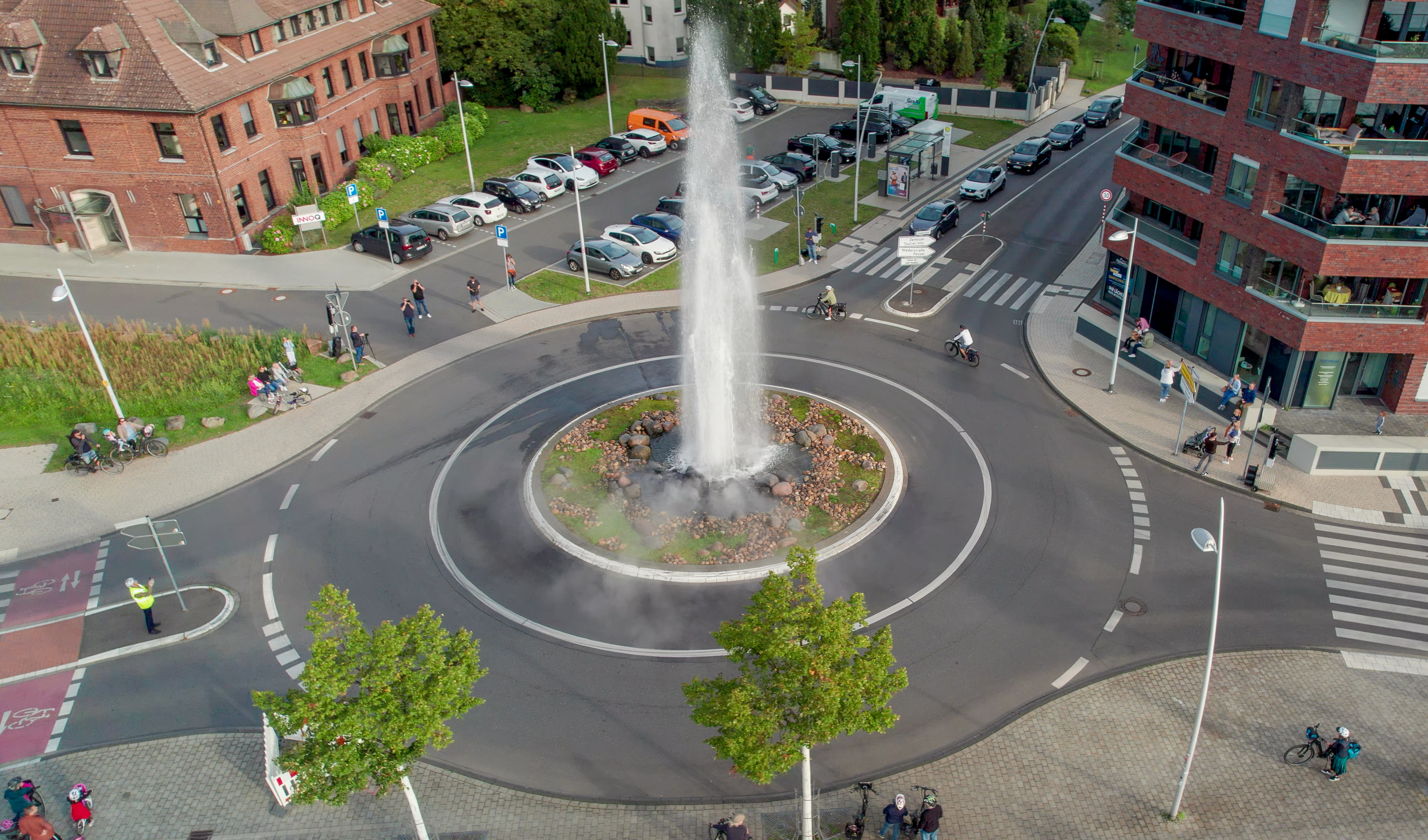 Wann genau der Geysir ausbricht, entscheidet die Natur. Denn immer erst wenn 64 Sonnenstunden gesammelt sind, wird die Insel im Kreisverkehr mystisch umnebelt. Bei erhöhter Nebelaktivität wird es am Dienstag immer wieder kleinere sowie vier größere Ausbrüche geben, für die der Verkehr viermal durch Ampelschaltungen für wenige Minuten gestoppt wird. Am Ende schießt die Wassersäule bis zu zwölf Meter hoch auf.
