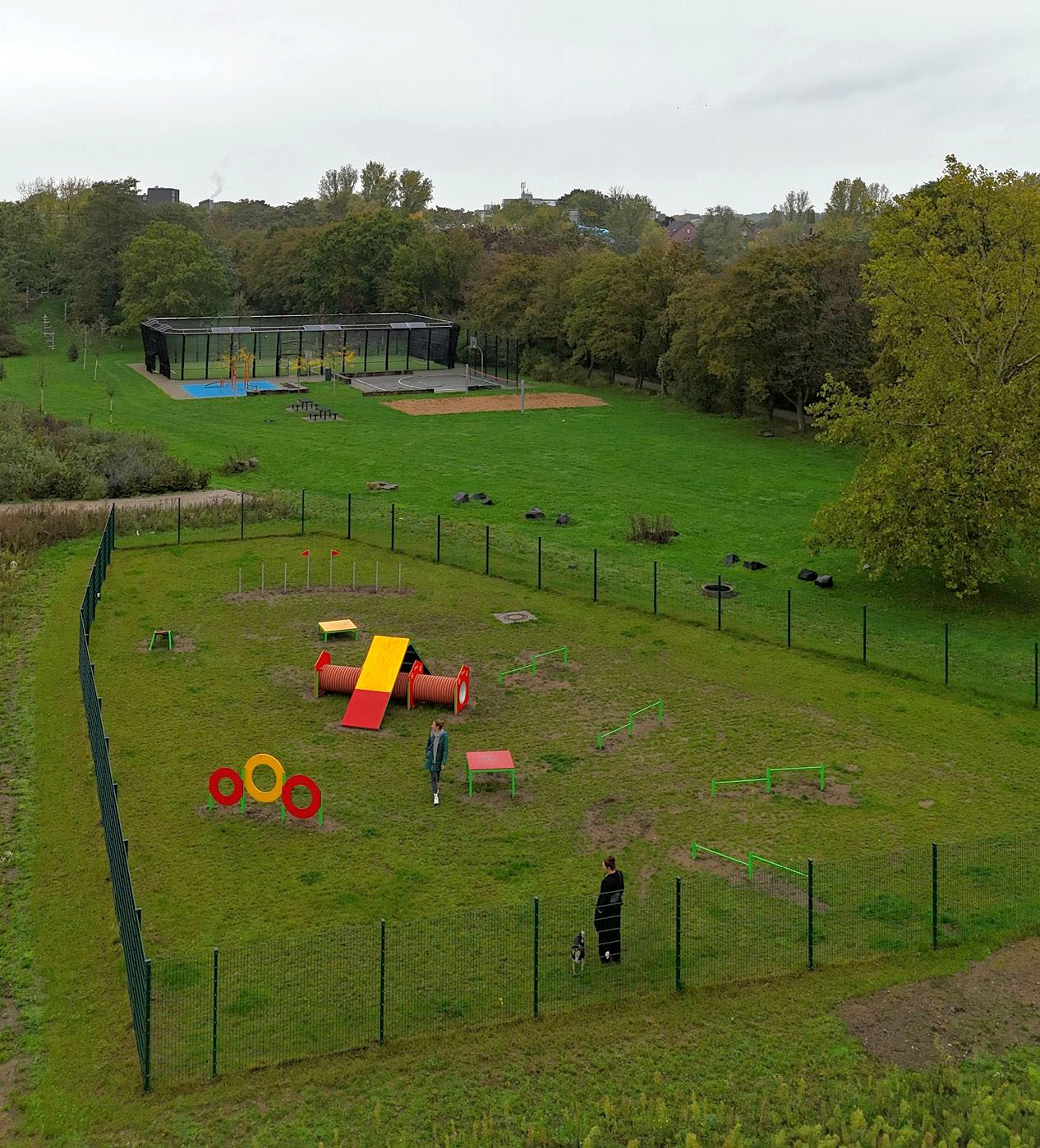 Neun unterschiedliche Elemente laden Hunde auf der Wiese zum Toben ein: eine Wippe, zwei Tische in 35 und 60 Zentimetern Höhe, Slalomstangen, zwei Höhenhürden, eine Schrägwand, ein Tunnel und drei Ringe zum Durchspringen. In den nächsten Wochen kommt außerdem noch eine Rampe dazu. Die Anschaffung der Geräte in Höhe von rund 40 000 Euro wurde durch die Stadt Monheim am Rhein finanziert. Mit der neuen Fläche erweitert die Stadt das Angebot an Hundewiesen und bietet Halterinnen und Haltern zusätzliche Möglichkeiten, ihre Tiere artgerecht zu beschäftigen und Kontakte zu anderen Hundebesitzerinnen und -besitzern zu knüpfen.