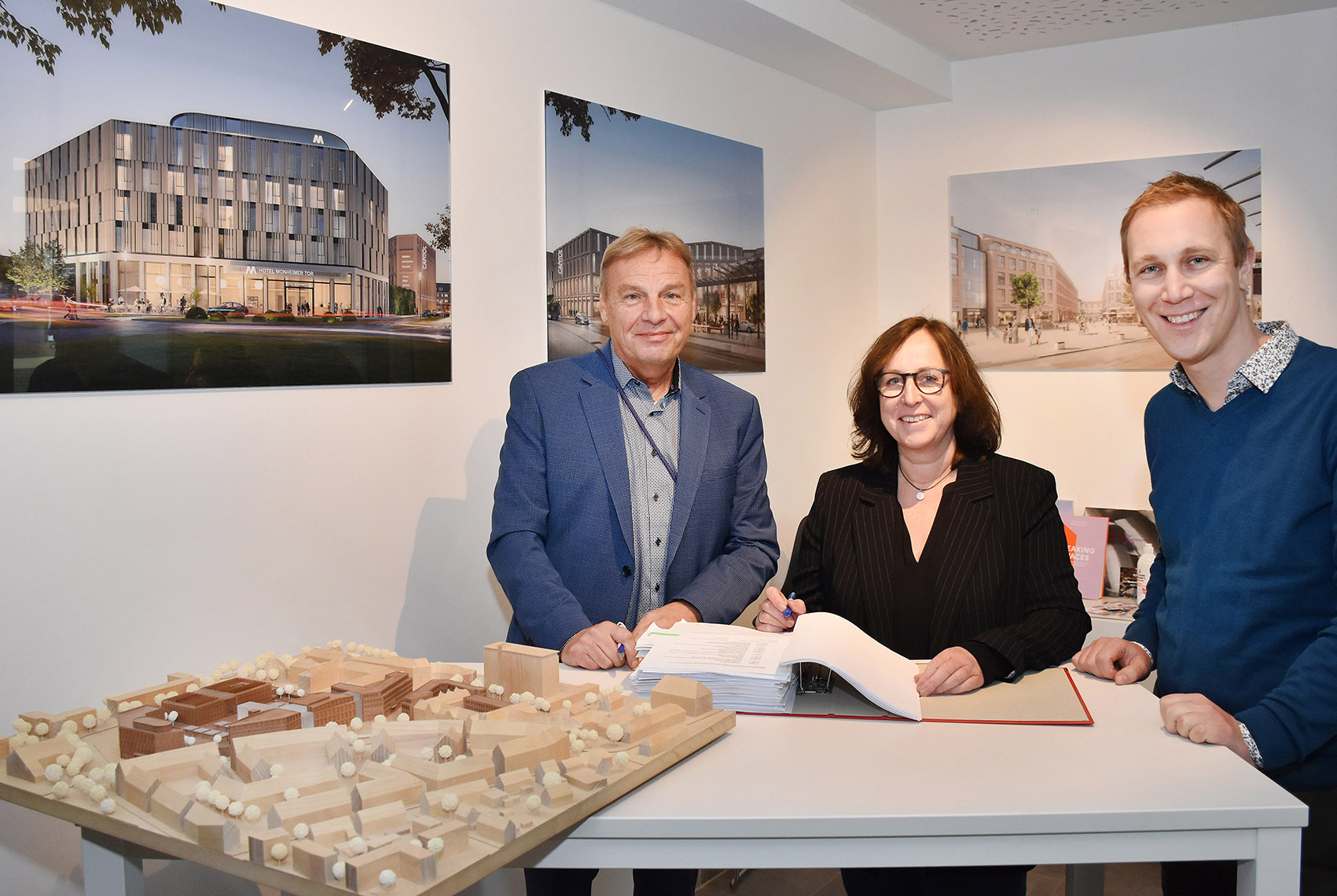 Mit dem Umbau des Monheimer Tors wird die Monheimer Innenstadt bis 2024 drei neue Stadthäuser erhalten, die an den bestehenden Gebäudekomplex angesetzt werden. Eines dieser Stadthäuser wird, von der Opladener Straße aus kommend, den künftigen Eingang in die Monheimer Stadtmitte bilden. Und dieses Tor bekommt sogar eine eigene Rezeption. Denn eröffnen wird dort ein Hotel der Marke Holiday Inn Express & Suites. Jetzt wurden die Verträge unterzeichnet.