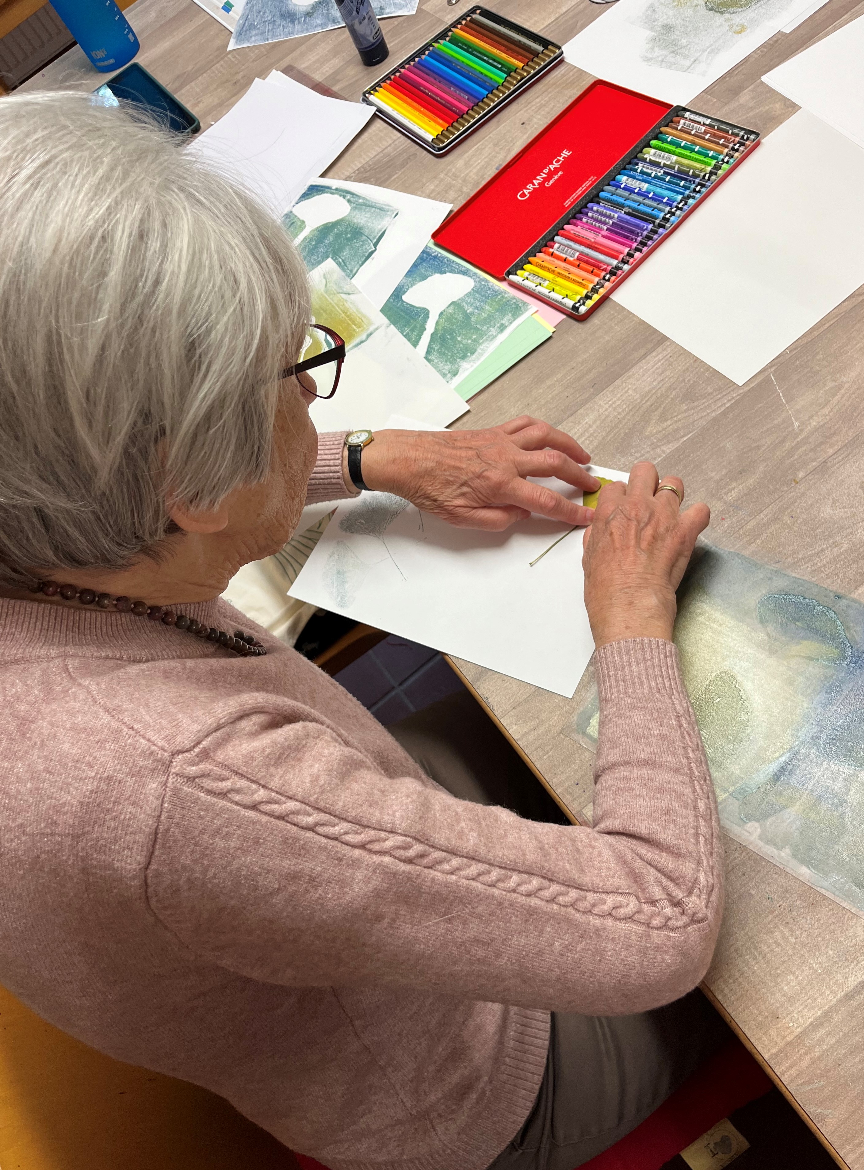 Das Offene Kunstatelier „Kreativ auf Augenhöhe“ richtet sich an Demenzerkrankte, die zusammen mit einer Begleitperson teilnehmen können, sowie an alle ältere Menschen, die Lust haben, sich künstlerisch auszuprobieren. In einer geschützten Atmosphäre können die Teilnehmerinnen und Teilnehmer ihrer Kreativität freien Lauf lassen und mit Farben, Formen und Materialien experimentieren. „Wir bieten jeden Donnerstag ein Thema wie zum Beispiel Druck, Pastellkreide, Acryl- oder Aquarellfarbe an. Aber generell kann jeder ausprobieren, worauf er Lust hat“, sagt Dozentin Jennifer Saikowski-Peter.