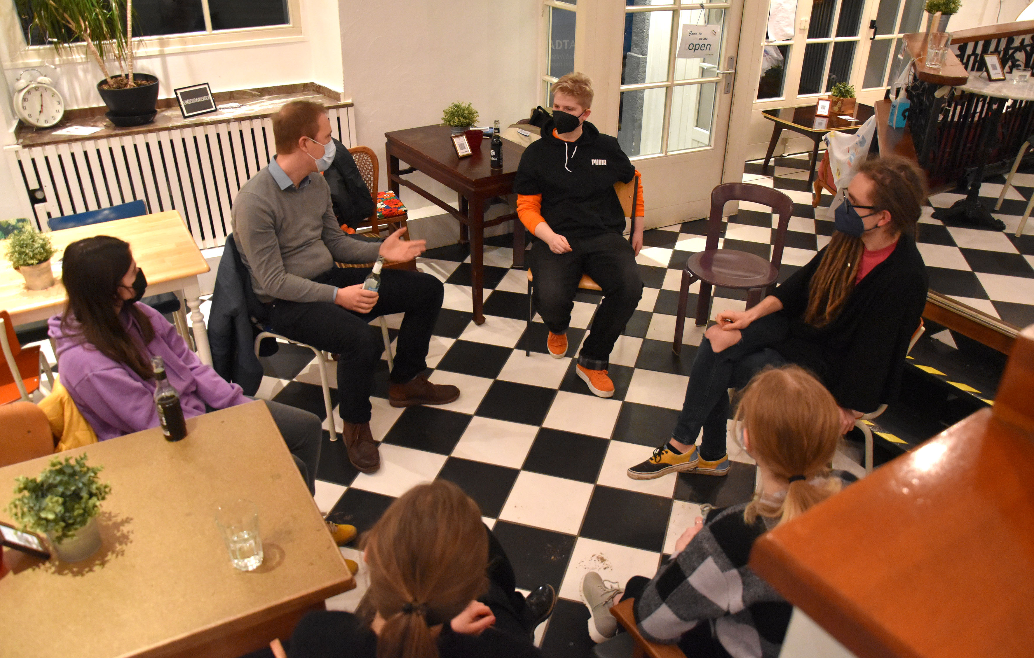 Bürgermeister Daniel Zimmermann tauscht sich im Rheincafé mit den Jugendlichen aus. Foto: Birte Hauke