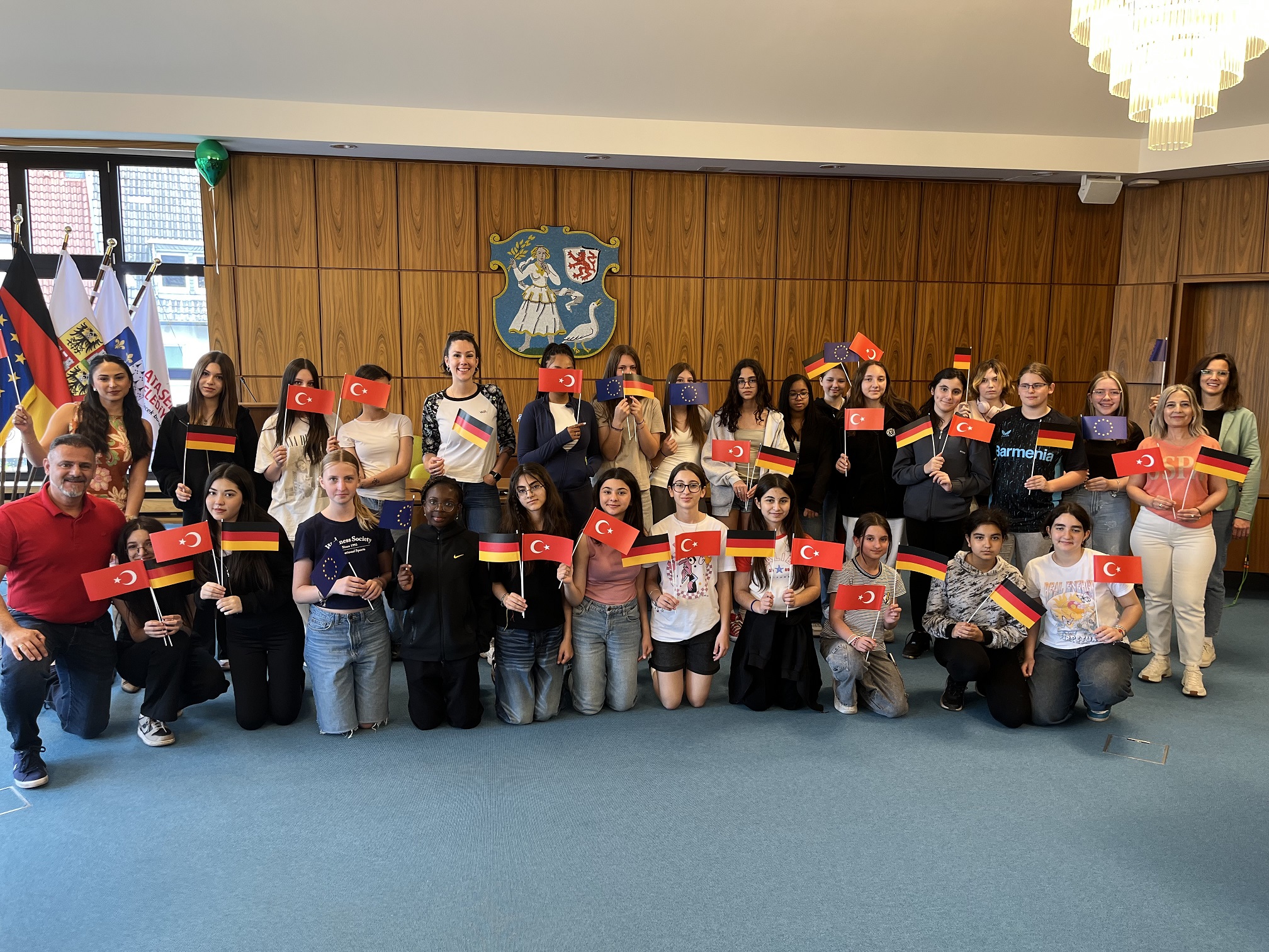 Schülerinnen aus der türkischen Partnerstadt Ataşehir in Istanbul statten Monheim am Rhein derzeit einen sechstägigen Besuch ab. Die insgesamt 13 Schülerinnen und zwei Lehrerinnen der Ihsan-Kursunoglu-Mittelschule sind zu Gast bei der Schulgemeinschaft der Peter-Ustinov-Gesamtschule. Im Fokus des regelmäßig stattfindenden Schüleraustauschs steht das Thema Umweltschutz, genauer die Thematik rund um die richtige und nachhaltige Mülltrennung.
