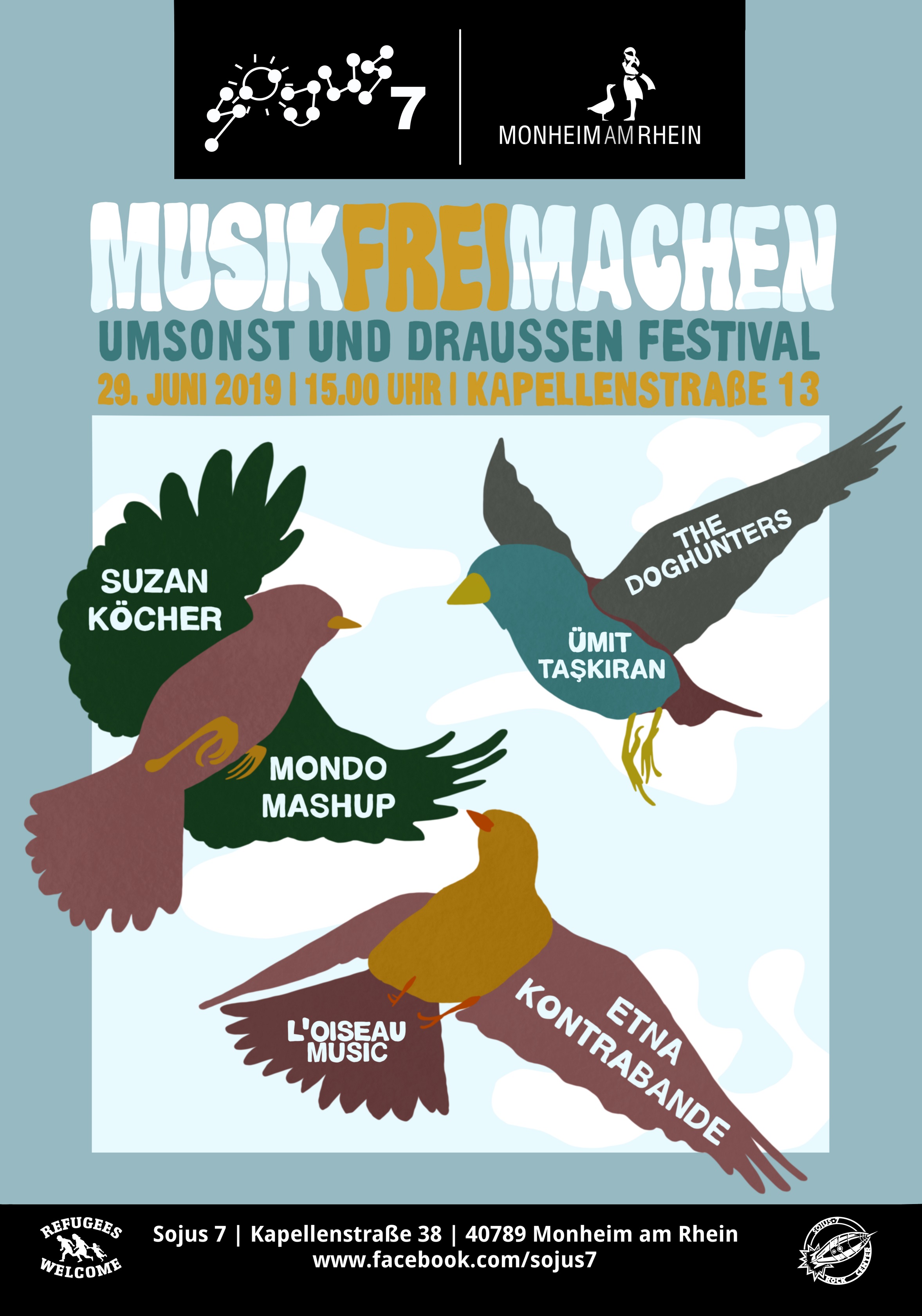 Die Festival-Leitung übernimmt auch in diesem Jahr Adrian Breuer, der das Festival im vergangenen Jahr im Rahmen seines Freiwilligen Sozialen Jahrs ins Leben gerufen hatte. „Das Format ‚Umsonst und Draußen‘ schafft ein sehr niederschwelliges Festival: Unser Motto ‚Musik frei machen‘ ist auch Programm. Es können nicht nur alle kommen und gehen, wann und wie sie möchten, es geht mir auch darum, musikalische Genregrenzen zu überwinden und die Grenzen der Musik mit einem möglichst diversen Programm zu öffnen“, erklärt der Ehrenamtler. Das kostenlose Festival im Freien ohne Einzäunung solle es jeder und jedem ermöglichen, in diesen Kunstgenuss zu kommen. Insgesamt werden sechs Bands erwartet. Auf der Bühne stehen die Rock-Band The Doghunters, Straßenmusiker L'oiseau Music, Sängerin Suzan Köcher mit ihrer Band Suprafon, fünf Bands der Formation Mondo Mashup, Ümit Taskiran mit seiner Band aus der türkischen Partnerstadt Ataşehir und die Band Etna Kontrabande aus der polnischen Partnerstadt Malbork.