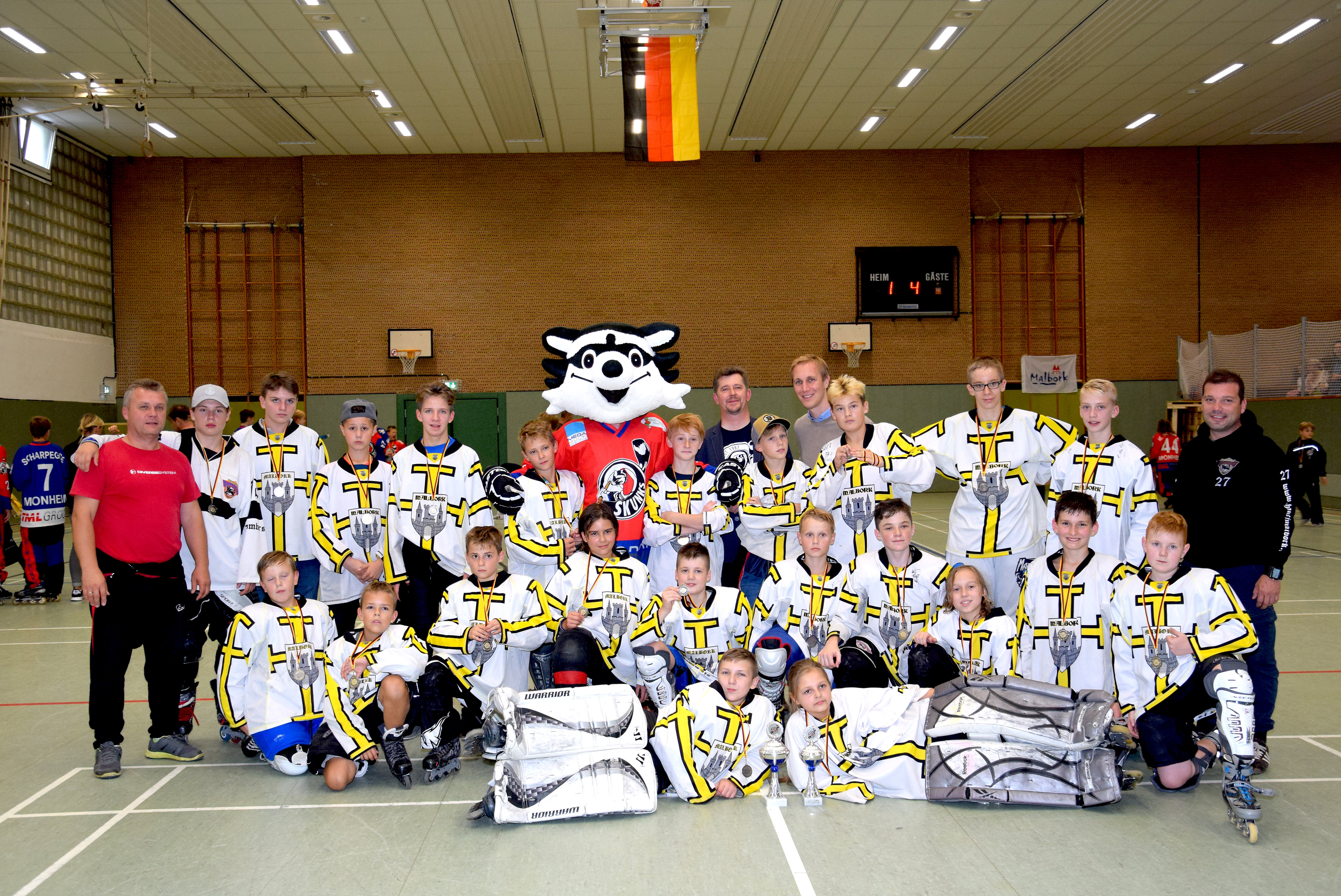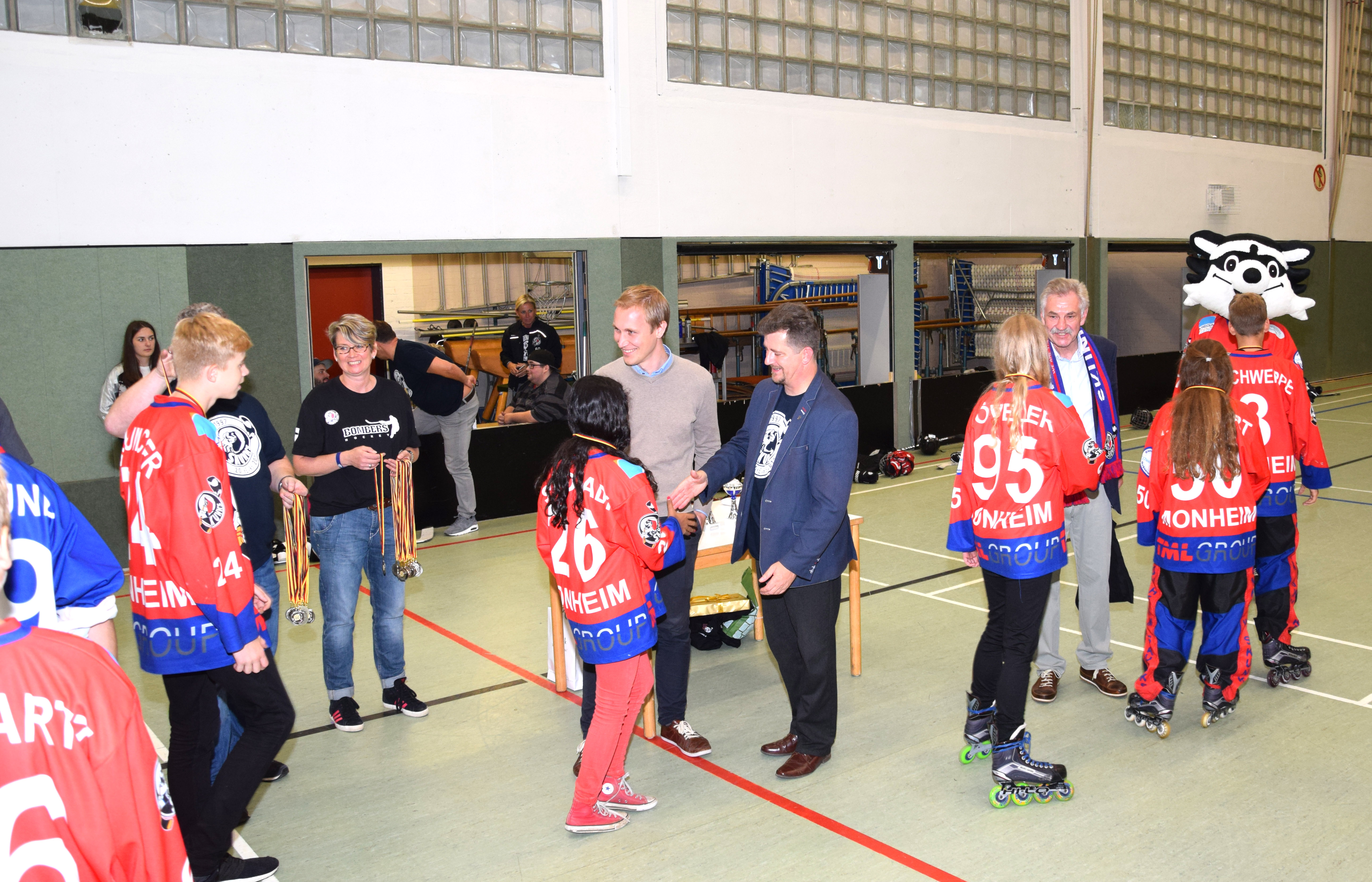 Am Sonntag wetteiferten dann dort zahlreiche Schüler- und Jugendmannschaften der Skunks, Bombers und Hilden Flames miteinander. Gewonnen haben am Ende alle. Im Vorfeld der Siegerehrung, mit den beiden Bürgermeistern als höchsten Gratulanten, trat die laut umjubelte Tanzgarde der Monheimer Funkenkinder auf. Anschließend wurde gemeinsam im Hof gegrillt und weitergefeiert. Und sogar die „Alten Herren“ aus beiden Städten griffen in der Sporthalle nochmal zum Hockeyschläger.