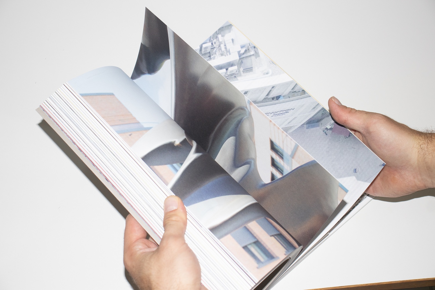 Der Katalogentwurf des Design-Duos Paul Daubenspeck und Lynn Ruberg überzeugte einstimmig die städtische Kunstkommission. Zuvor hatten sie an einem studentischen Wettbewerb in Zusammenarbeit mit der Peter Behrens School of Art in Düsseldorf teilgenommen, den die Kunstschule organisiert und betreut hatte. Unter der Leitung von Holger Jacobs, Professor für Typografie, wurden fortgeschrittene Studierende eingeladen, ihren Blick auf die Monheimer Kunstwerke in Entwürfe zu übersetzen.