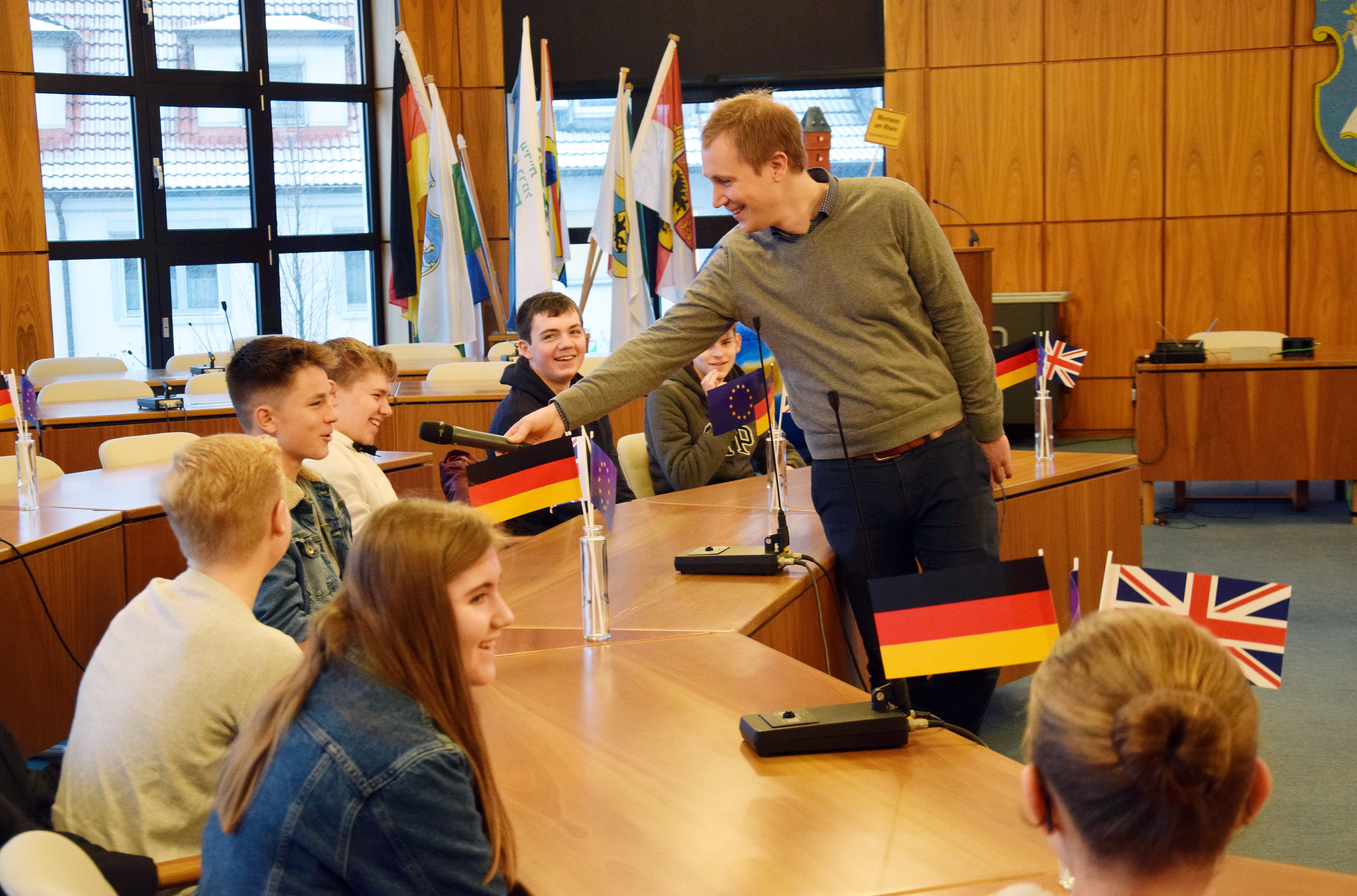 Zu ihrem Besuchsprogram gehört neben den Besichtigungen des Kölner Doms, des Bonner Hauses der Geschichte, dem Odysseum und dem Rautenstrauch-Joest-Museum der Kulturen in Köln auch ein kleiner Empfang bei Bürgermeister Daniel Zimmermann. Das Stadtoberhaupt begrüßte die Gastschülerinnen und Gastschüler mit ihren Lehrkräften, die in Begleitung von OHG-Lehrerin und Austauschkoordinatorin Heike Ibald das Rathaus besuchten. In einer kleinen Beamer-Präsentation stellte der Bürgermeister ihnen die Stadt im Ratssaal genauer vor.