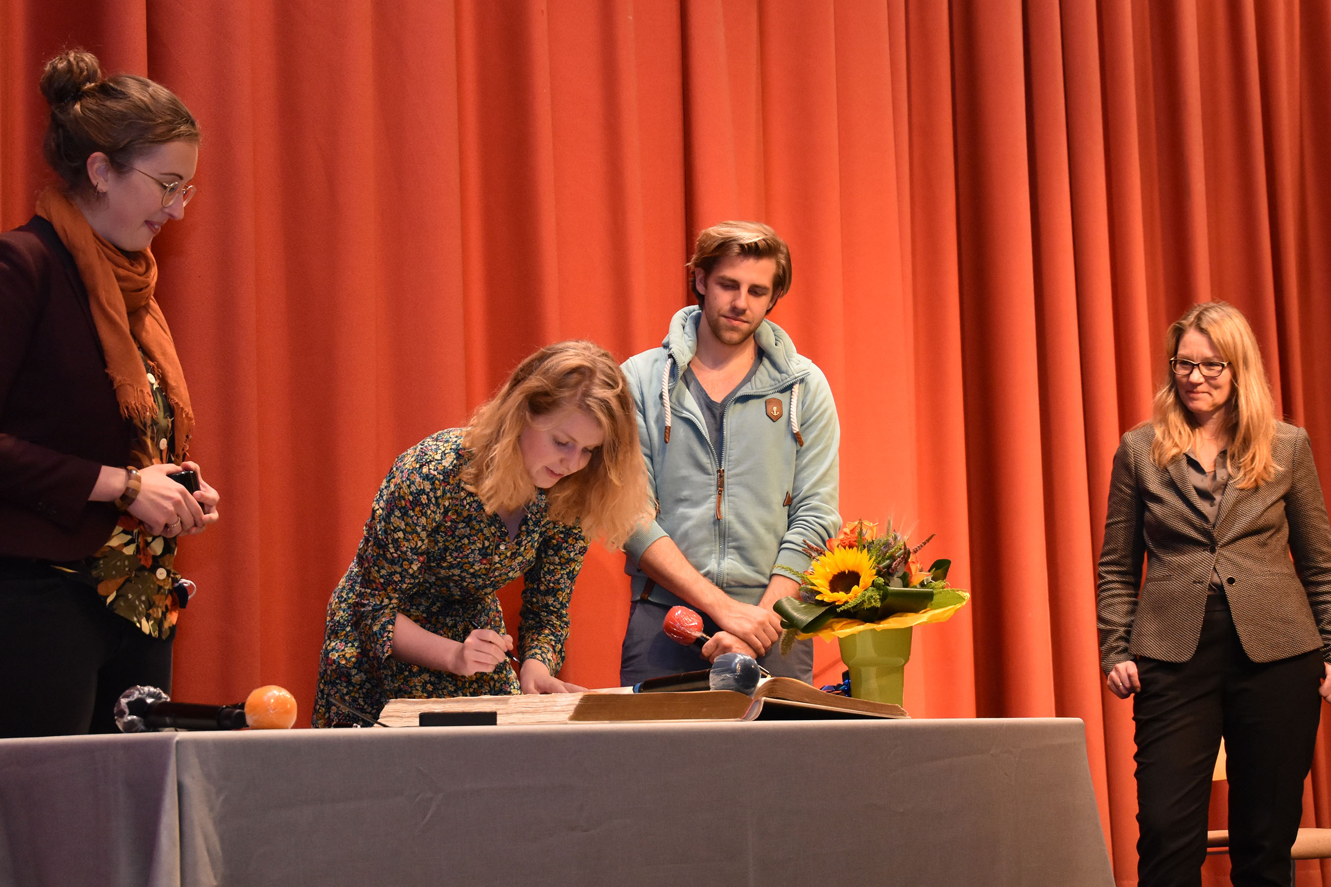 Das im Verlag Beltz & Gelberg erschienene Buch „Was wir dachten, was wir taten“ schildert in der Form eines beklemmenden Kammerspiels aus Perspektiven des Schülers Mark, seiner Mitschülerin Fiona und des Lehrers Herr Filler einen Schulamoklauf. Merlin Fargel und Lea-Lina Oppermann lasen in der Aula am Berliner Ring abwechselnd aus den verschiedenen Perspektiven. „Die Schülerinnen und Schüler waren absolut gespannt und konzentriert“, berichtet Siegfried Bast, Leiter des Jugendbereichs im Ulla-Hahn-Haus. Neben Fragen zur Ideenfindung und der Arbeit einer Autorin und eines Schauspielers stellten die Schüler Fragen zur gewünschten Wirkung des Buches. Oppermann will den Blick nicht nur auf den Schrecken, den ein Amoklauf ausübt, sondern auch auf Gruppenbildungen in Klassengefügen lenken: Wer ist cool? Wer ist der Außenseiter? Sie ermutigte die Schülerinnen und Schüler zum Hinschauen und Hinterfragen. Im Anschluss trug sich Lea-Lina Oppermann im Beisein der stellvertretenden Bürgermeisterin Laura Töpfer und Kirsten Witt, neue Leiterin des Bereichs Bildung und Kultur, in das Goldene Buch der Stadt ein. (bh)