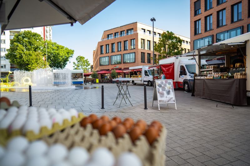 Neben dem Eierplatz findet der Monheimer Wochenmarkt wie gewohnt auch auf der Heinestraße, der Friedrichstraße und dem Ernst-Reuter-Platz statt. Und weil sich die Marktfläche rund um das Monheimer Tor weiter vergrößert, bleibt der Ingeborg-Friebe-Platz wie in den letzten Wochen als Marktplatz erhalten.