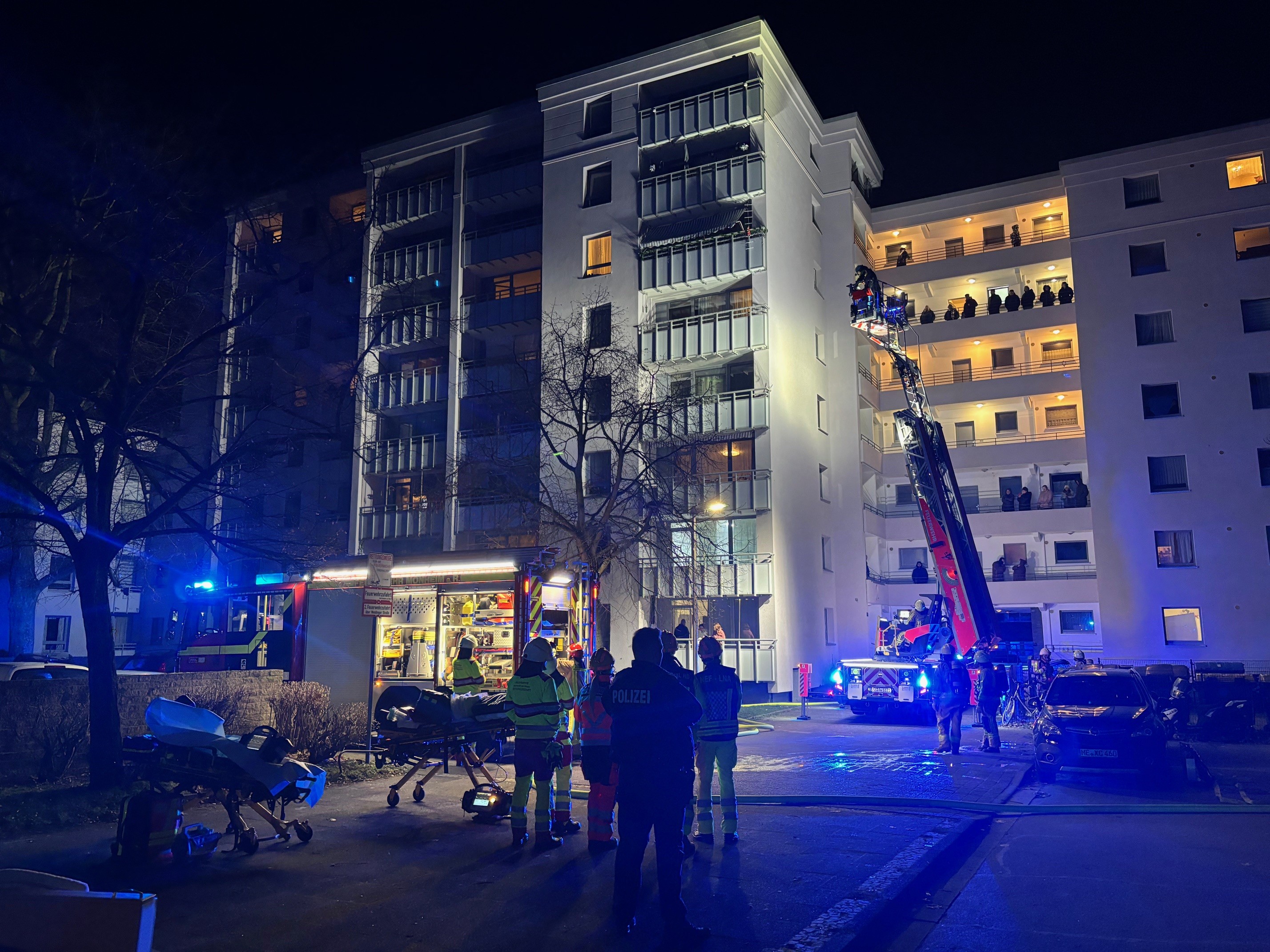 Dichter Rauch hatte sich im gesamten Gebäude ausgebreitet. In allen Geschossen machten Bewohnerinnen und Bewohner an Fenstern und auf Balkonen auf sich aufmerksam. Der Bewohner der Brandwohnung konnte sich selbstständig ins Freie retten und erlitt lediglich leichte Verletzungen. Aufgrund der unübersichtlichen Lage in dem achtgeschossigen Wohngebäude wurde die Alarmstufe erhöht und ein zweites Einsatzfahrzeug mit Drehleiter aus Langenfeld nachalarmiert. Insgesamt kontrollierten die Einsatzkräfte 43 Wohnungen auf Brand- und Rauchausbreitung. Acht Personen erlitten leichte Rauchvergiftungen und wurden vor Ort ambulant durch den Notarzt versorgt; ein Transport in ein Krankenhaus war nicht erforderlich.