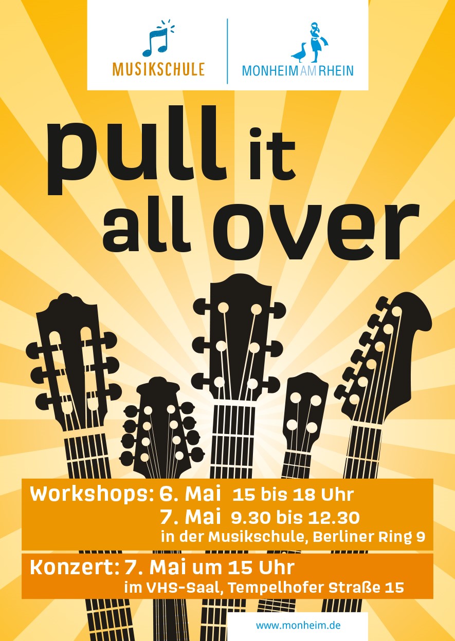 Wie funktioniert eine Ukulele? Wie entsteht Folkmusic? Und wie klingt ein Gitarrenorchester? Antworten gibt es in verschiedenen Workshops der Musikschule am Samstag, 6. Mai, und Sonntag, 7. Mai. Unter dem Motto „Pull it all over“ lädt der Fachbereich Zupfinstrumente Kinder, Jugendliche und Erwachsene zu vier verschiedenen Workshops ein. Zum Abschluss gibt es ein Konzert.