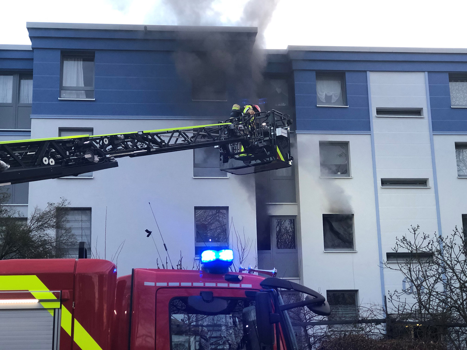 Nicht so glimpflich ging ein weiterer Küchenbrand in der Tempelhofer Straße aus. Am Nachmittag ging der Notruf bei der Feuerwehr ein. Im ersten Obergeschoss drang bei Eintreffen der Hauptamtlichen Wache dichter Brandrauch aus der Wohnung. Zwei Trupps gingen unter Atemschutz in das mehrgeschossige Wohngebäude vor und kontrollierten die Wohnung zunächst auf eventuell vermisste Personen. Parallel dazu wurde der Treppenraum belüftet, um die restlichen Wohnungen rauchfrei zu halten, die ebenfalls auf vermisste Personen und Rauchausbreitung kontrolliert wurden.