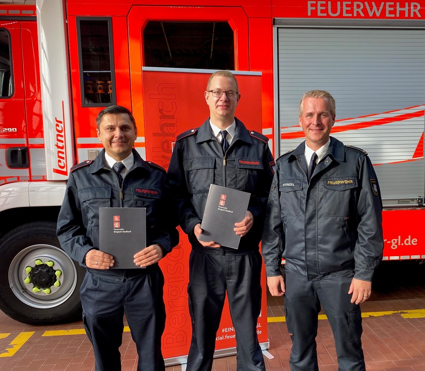 Die Zeugnisübergabe fand im Rahmen eines Festakts auf der Feuer- und Rettungswache 1 in Bergisch Gladbach statt. Neben den Brandmeisteranwärtern aus Monheim am Rhein nahmen auch Absolventen aus Bergisch Gladbach und Köln teil. Die Urkunden überreichte der Leiter der Feuerwehr Bergisch Gladbach, Jörg Köhler. Begleitet wurden die beiden Monheimer Absolventen von Markus Stenzel, dem stellvertretenden Leiter der Feuerwehr Monheim am Rhein. Im Anschluss an die offizielle Zeugnisverleihung fand die Ernennung zum Brandmeister im Rathaus statt. Mit Lukas Tillmann und Patrick Theberath zählen nun beide Wachabteilungen der hauptamtlichen Wache jeweils 32 Mitarbeitende. (tb)