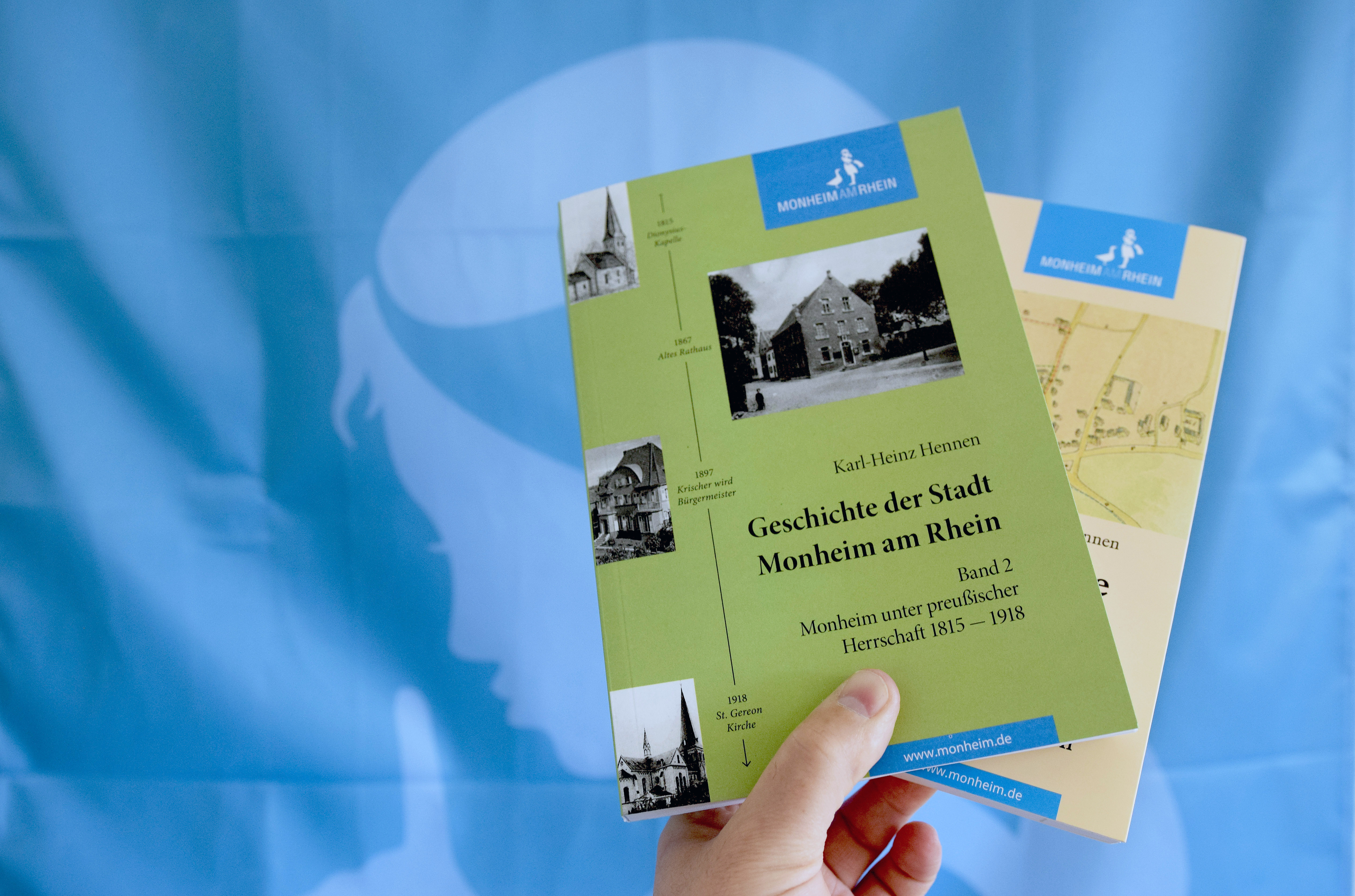 Bürgermeister Daniel Zimmermann und Autor Karl-Heinz Hennen stellen am 6. April den zweiten Band der „Geschichte der Stadt Monheim am Rhein“ vor